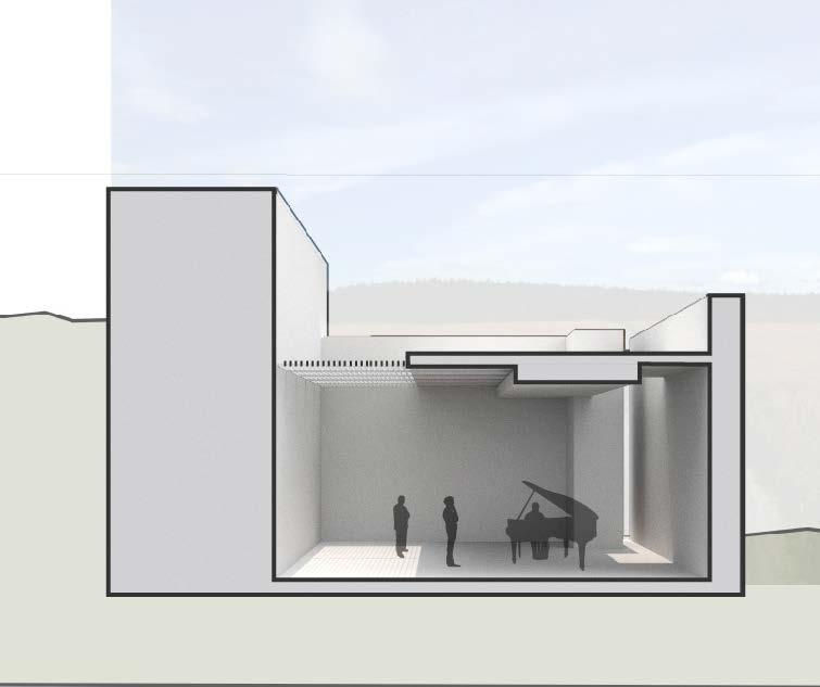 The music space sits sunken into the ground and sarrounded by earth and thick walls. This creates a sound proof space with a minimal and quiet light condition