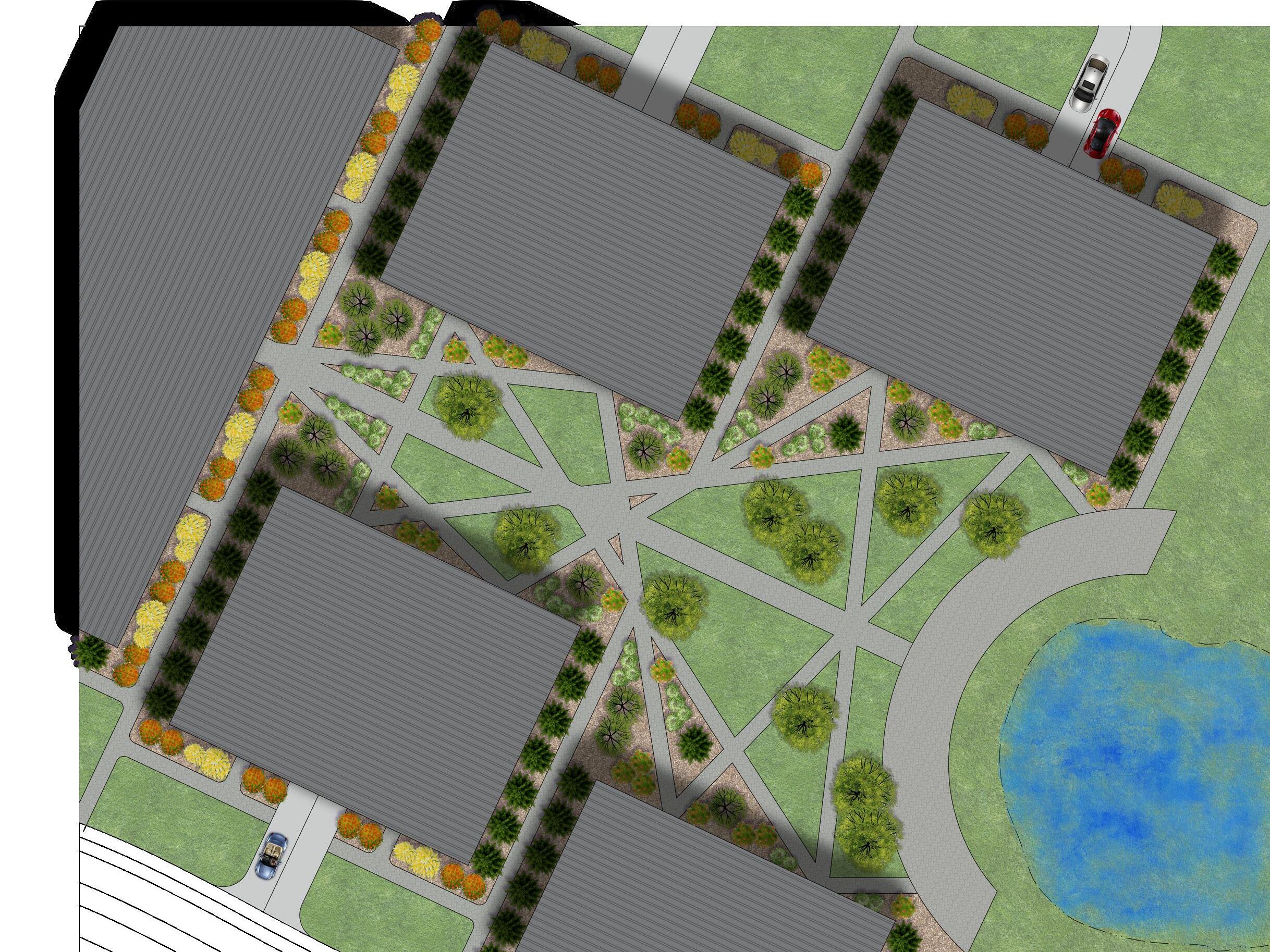 Consisting of seven 3 story tall buildings, this office complex is organized around a pond acting as a focal point with fountains and a stepped plaza. Native planting beds frame each building, shaded lawns create picnic areas, and symmetrical walkways provide visual interest while ensuring efficient movement between buildings.
