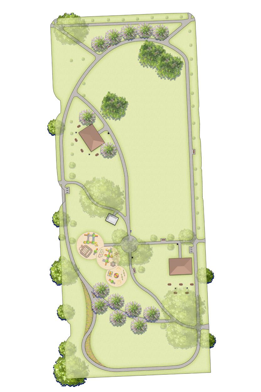 This multifunctional park for The Greens of York combines recreation and habitat. Trails, boardwalks, play and athletic field amenities are located between restored prairie and riparian edges to the south and preserved mixed‑hardwood forest along Buck Creek to the north. Native plantings frame the entrance, and rain gardens around the parking area manage stormwater.