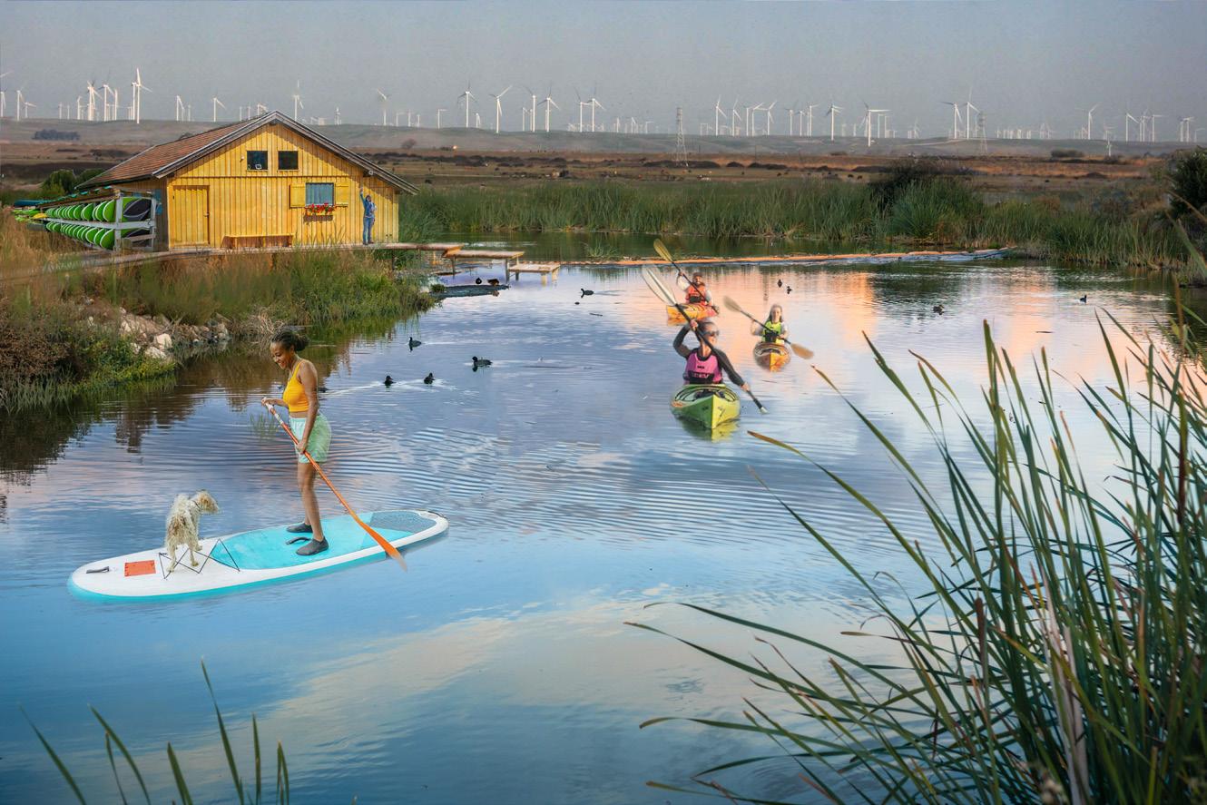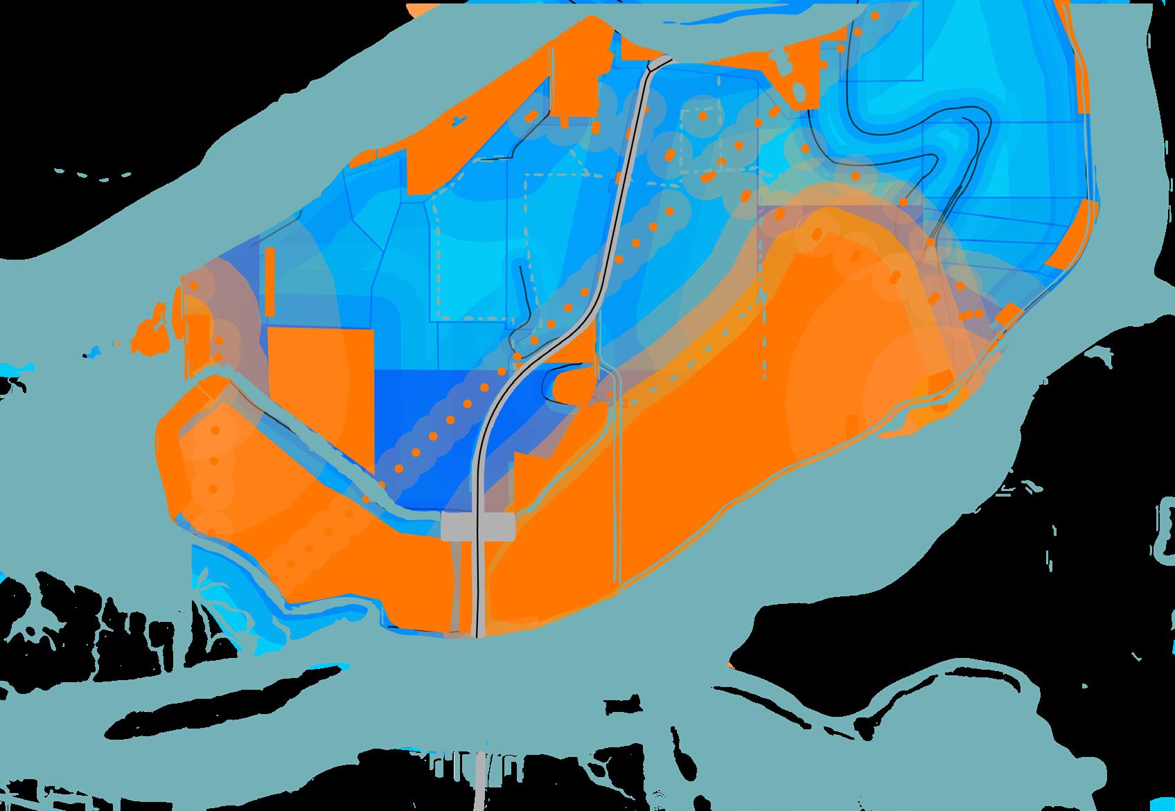 Our team conducted a suitability analysis of Sherman Island in the Sacramento San Joaquin Delta to identify a site for wetland expansion and a water sport livery. We mapped opportunities (water access, road proximity, usable parcels, wetland adjacency) and constraints (motorized launches, protected wetlands, private/ unusable parcels, power lines) to identify a site that met our project goals. The chosen site connects restored marshland on the island’s west canal and provides a launch for canoeing, kayaking, and paddleboarding to engage visitors with the restoration work.