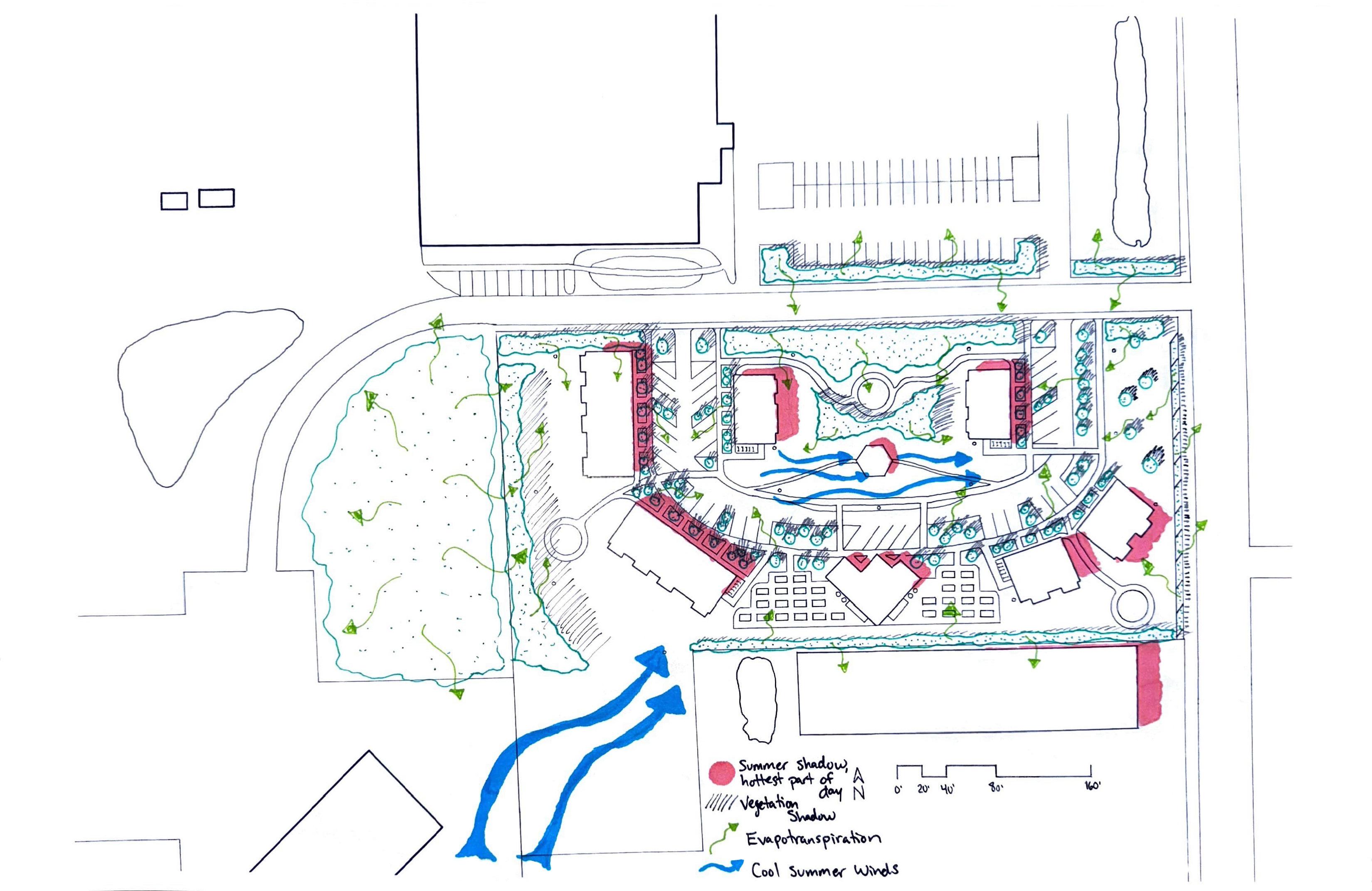 Monarch Bend transforms a high‑traffic commercial site into a resilient, community‑focused affordable housing development. Design strategies prioritize thermal comfort and social connectivity, integrate raingardens and native plantings for stormwater retention, and incorporate endangered milkweed species to support monarchs and other pollinators. Building placement creates distinct hierarchies of private, semi‑private, and public spaces while vegetation buffers and solar exposure improve winter snowmelt and summer cooling.