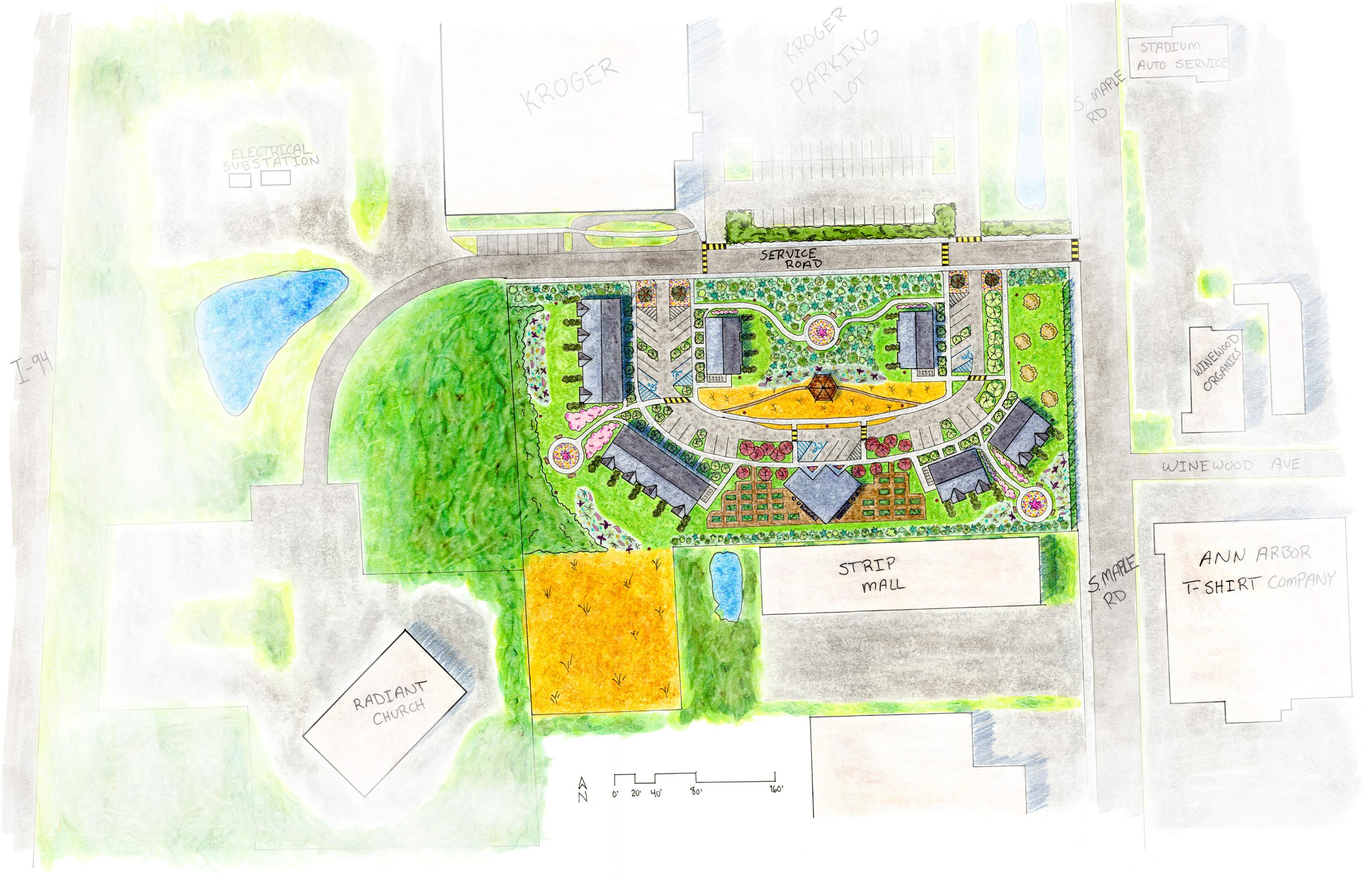 The Greens of York converts a discontinued golf course into a 118‑acre mixed‑use community focused on green infrastructure. Commercial uses occupy the former disturbed footprint on the north end, while agrivoltaic farming, stormwater management, native plantings, and biking/walking networks enhance quality of life and ecosystem services. Development avoids Buck Creek and the adjacent mixed‑oak woodlands to protect and restore vital habitat.