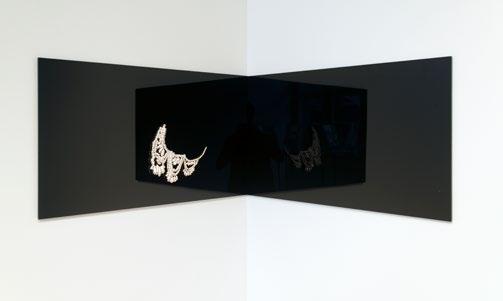 Mike and I work in strategically similar ways, but with different subjects, as his subject is film, and mine is jewelry. We have always thought together through one another’s projects and at some point, the ideas felt so entangled that we decided it was time to truly collaborate. For Marble, Mirrors, Pictures and Darkness, Mike and I wanted to examine representations of jewelry, luxury and glamour as depicted in cinema. Since film is so absorptive for the spectator, we reconstructed jewelry objects and their partial settings from these narratives to deconstruct and perhaps neutralize the immersive nature of this media format. We often removed the character that was affiliated with the object and scene. One scene in the film,\ To Catch a Thief, is a staged procession of characters wearing elaborate jewelry. In Intervals of Time, we installed work sourced from that scene. We recreated the time sequence of jewelry worn on the characters, based on several, progressive views advancing in space, from the distanced (minute object) to the advanced (magnified object) that fills, and is cropped by, the frame of the film. We installed these objects in a procession through space, with the space between the objects approximating the succession of the jewelry in the scene. The jewelry was then mounted to two-way mirror and light stands to complicate their procession, and recession, into actual space.
