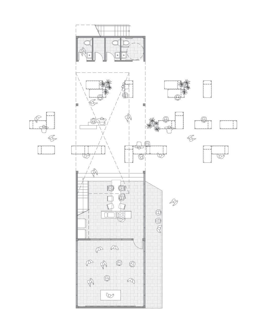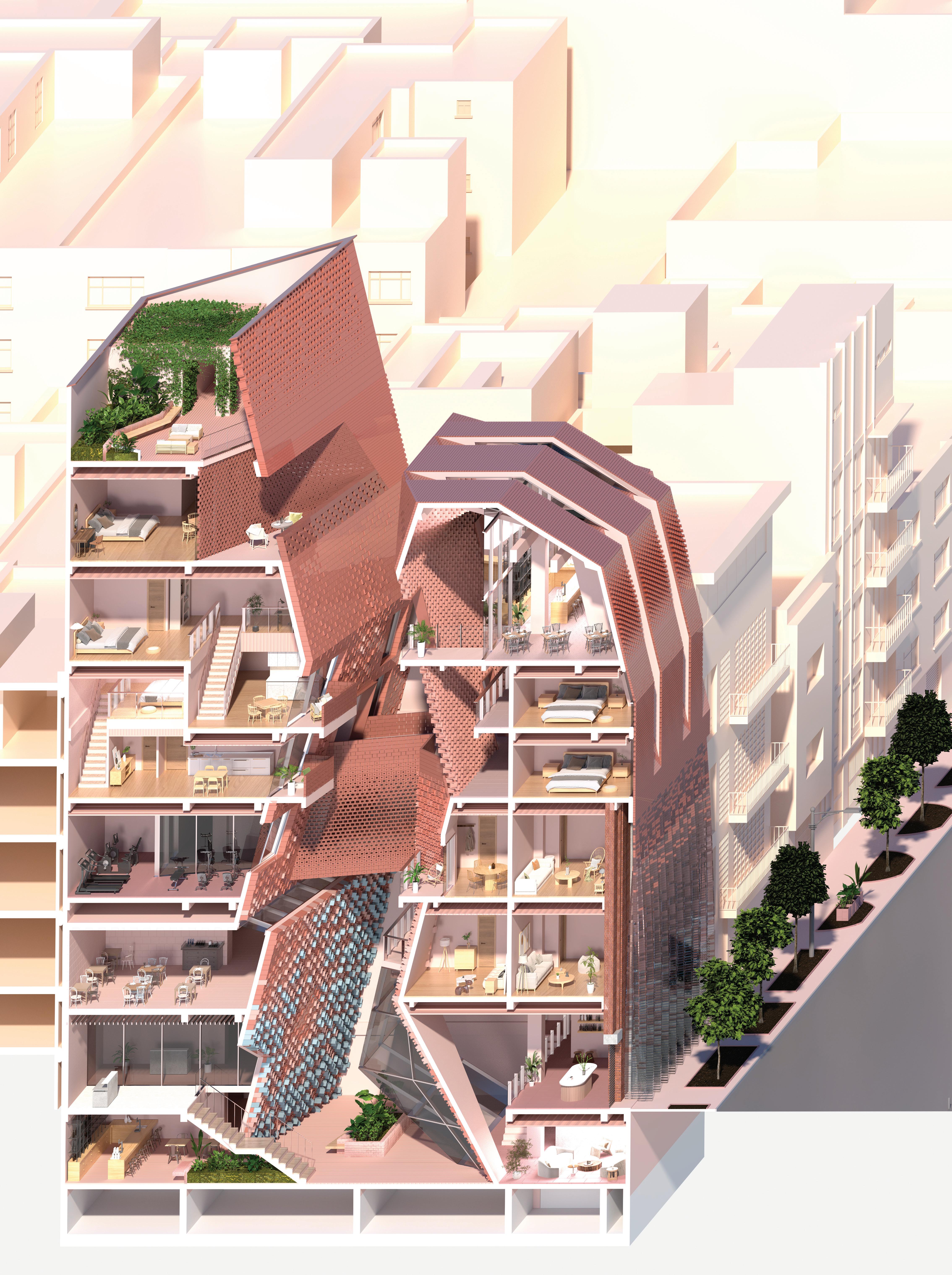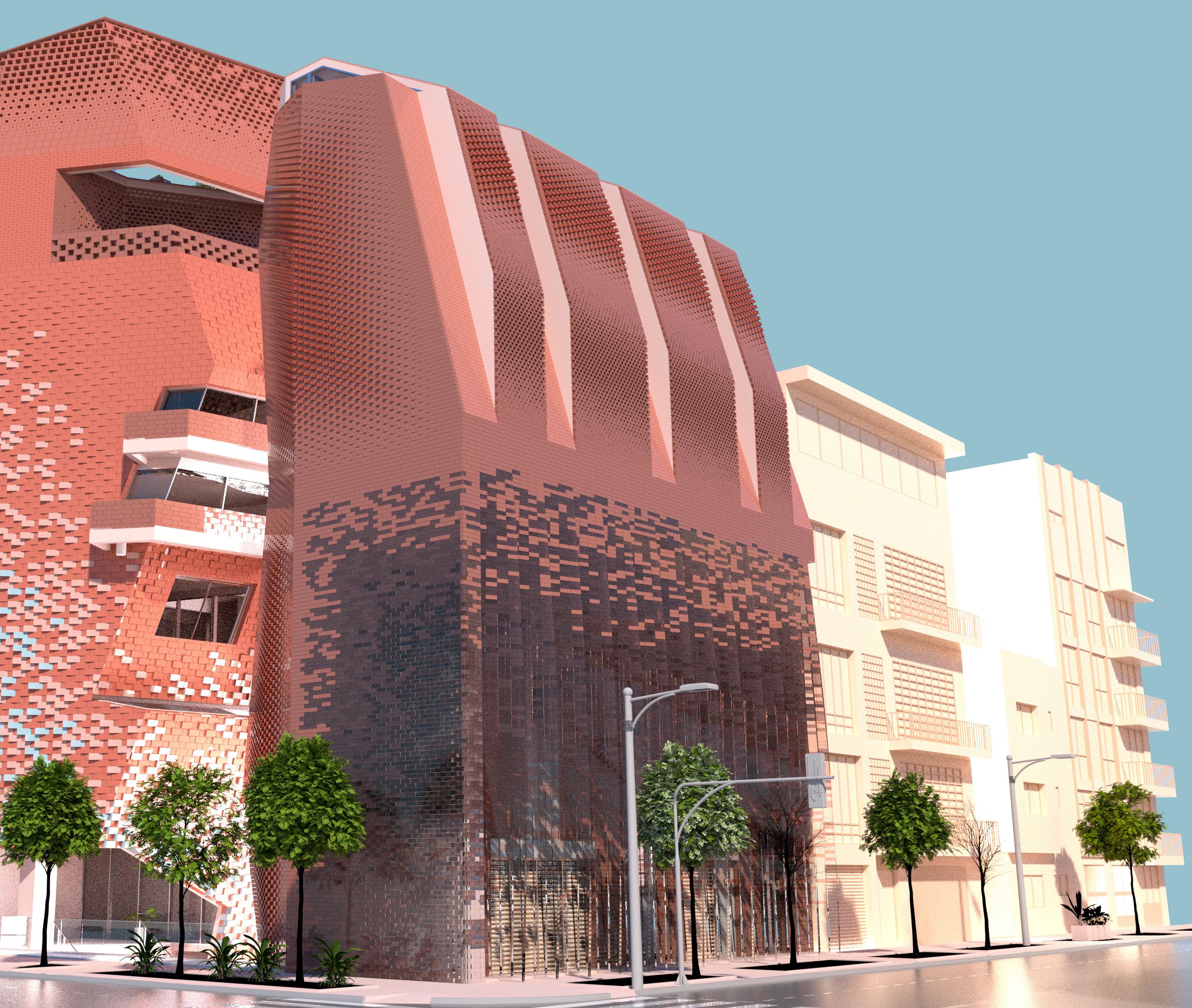 Our strategy aims to maximize the continuity of the brick façade. This involves incorporating hollow bricks of various sizes to visually connect indoor and outdoor spaces. These bricks are strategically placed to rotate based on the street view or light conditions. Additionally, we have extruded bricks of different lengths to create an undulated effect on the flat brick wall, resulting in a dynamic light effect. The bricks in this building are not just simply construction materials that encapsulate indoor space, rather the bricks are the medium that connect the surrounding and environment.