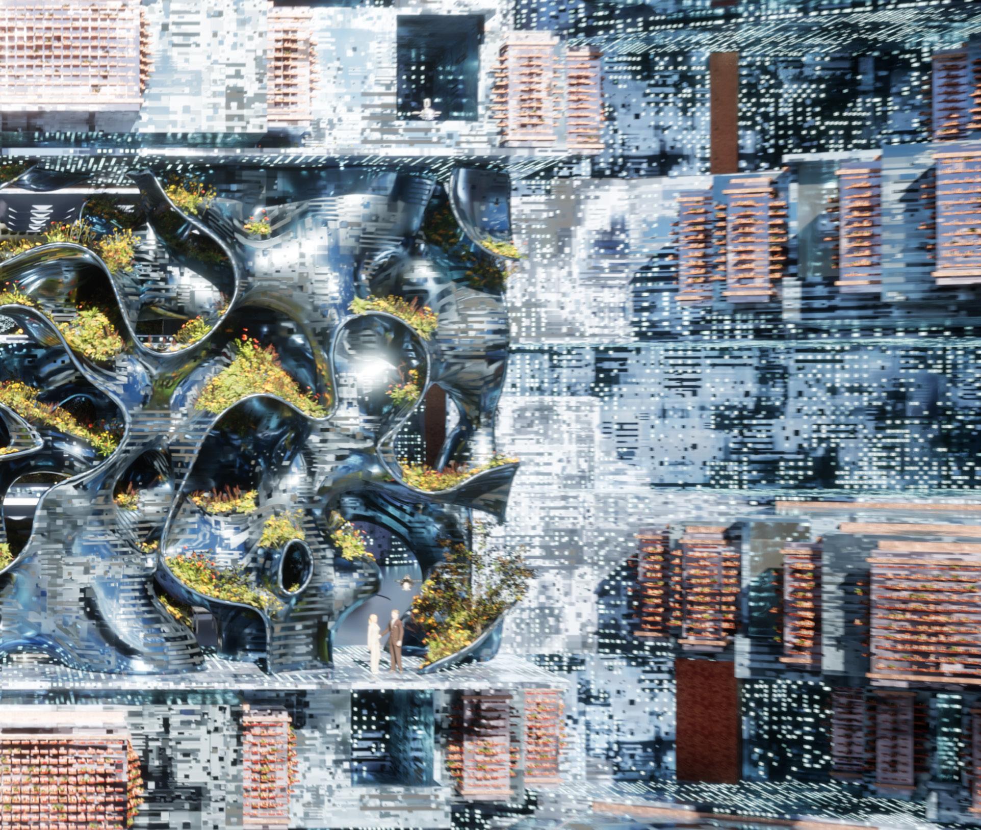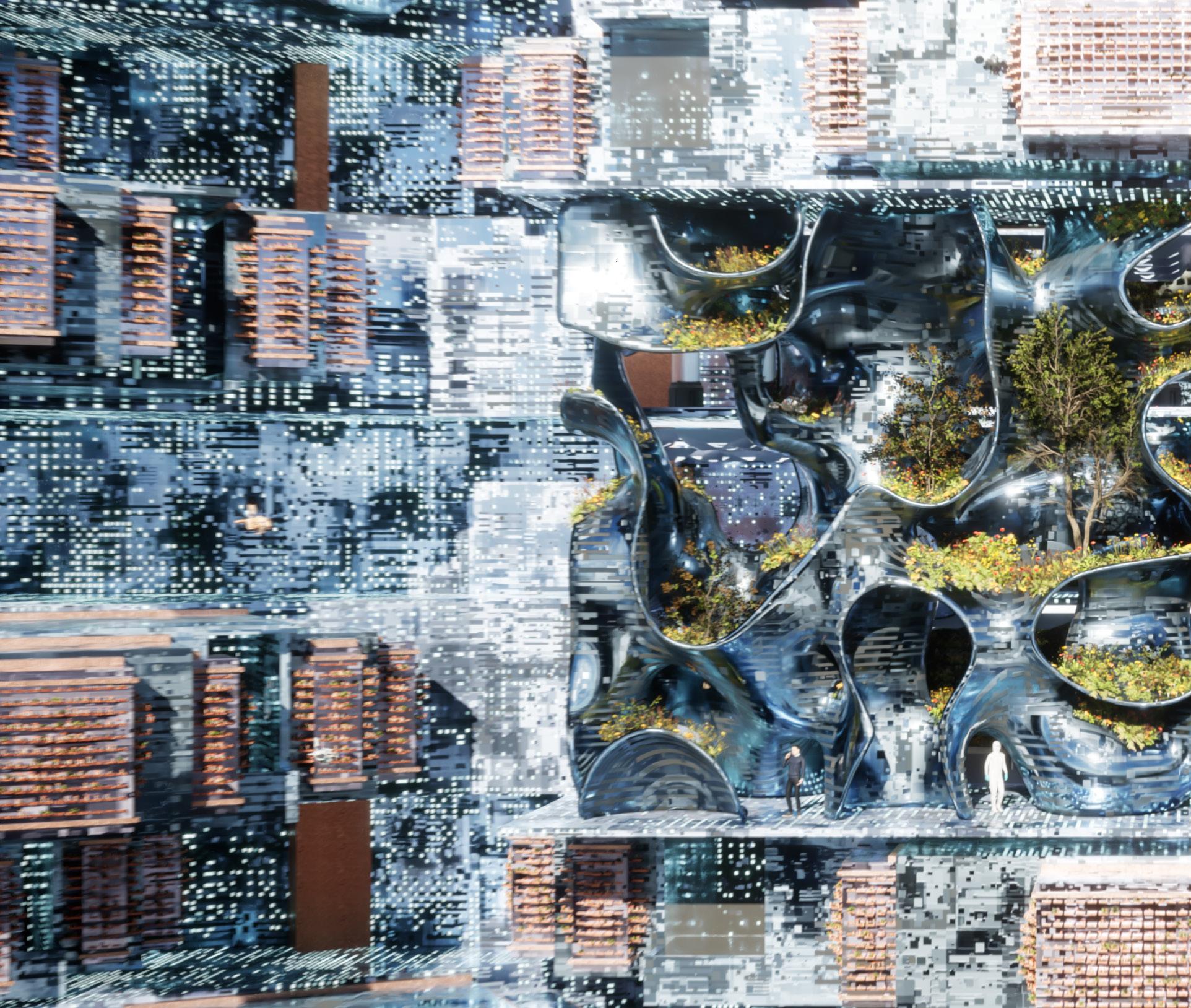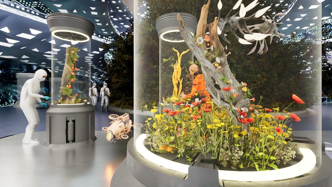 The project’s inception originated from AI-GAN training, utilizing artificial intelligence to align the lab and forest with our envisioned future. Architectural elements were integrated with space and function, resulting in abstract hybrid images. Moreover, the fusion of fungi, flowers, and mechanics explores and represents the voiceless individuals impacted by human decision-making regarding the planet.