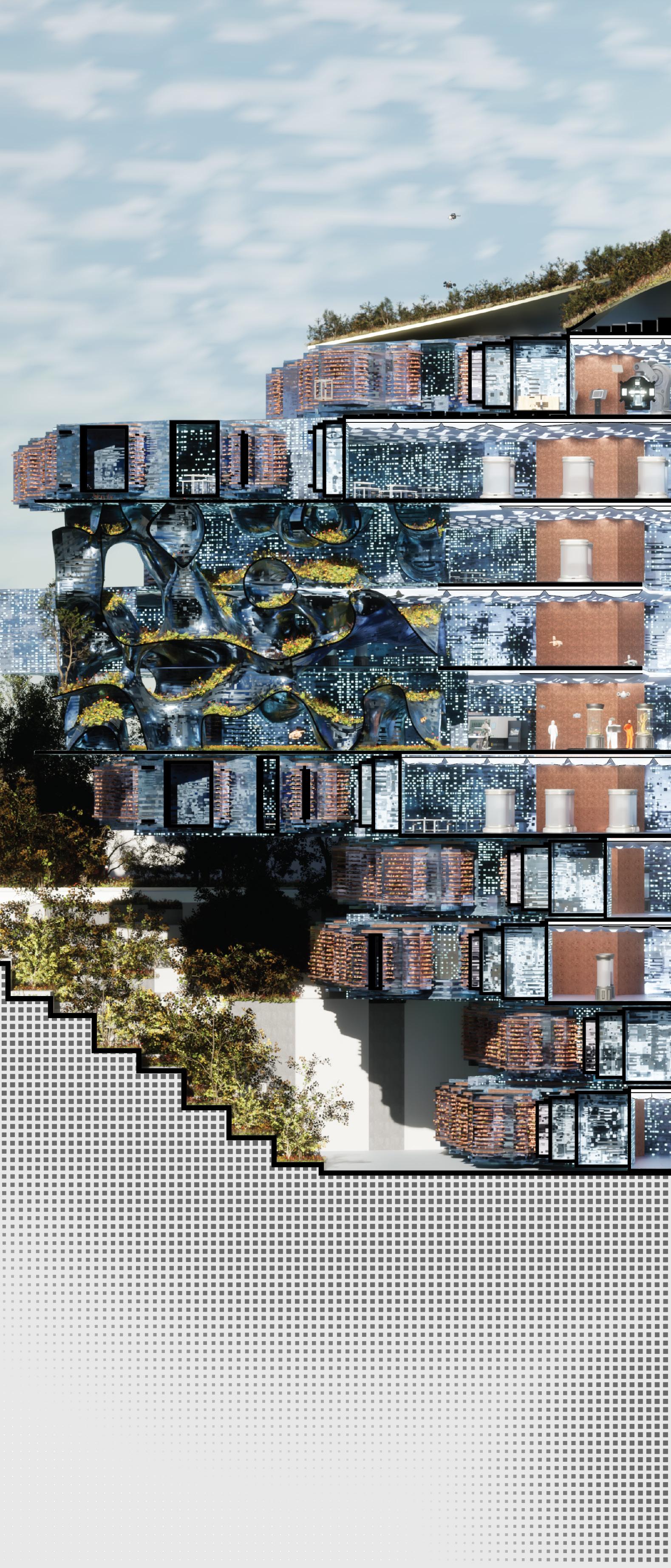 The program’s objective is to develop self-regulating ecosystems that seamlessly integrate into the current ecological context. It equips both biotech and human entities to navigate unforeseen futures. A bio-based economy strives to substitute unsustainable fossil-based resources and processes with renewable alternatives, generating everyday products from renewable biomass. The laboratory as a library, in the experimental process would generate a massive culture library that is constantly growing.