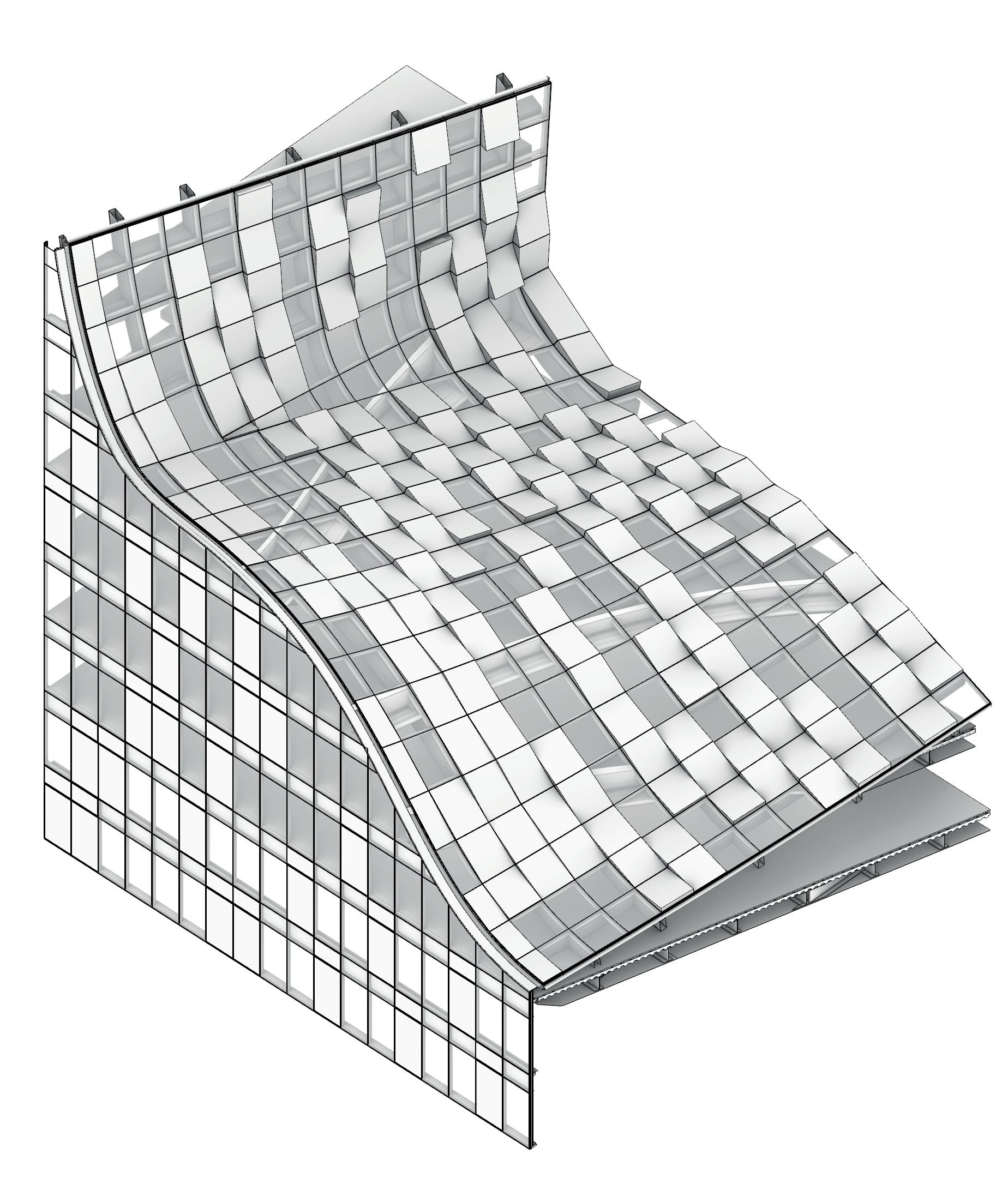 by manipulating lighting, visibility, and materiality of the brick façade. The strategy is keeping the existing brick façade, and then the new brick façade can blend into the existing one. So, we design several twisted strips of gradient glass brick walls outside the existing façade. It creates a sense of dissolving effect that reveals part of the existing building, transiting two kinds of bricks gradually at this corner. So, the glass bricks enable a visual connection between the new and original building. People on the road can now more clearly see the glass elements merging with the original brickwork, which is meant to give the illusion of a folding and dissolving wall.
