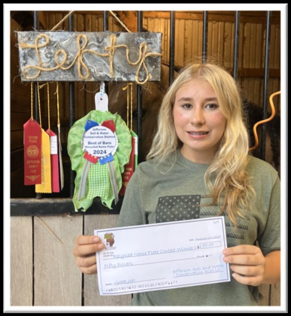 JSWCD Recycled Name Plate drawing. Lina’s name was drawn during the Natural Resources Ag Field Day and announced during the Livestock Auction. She entered her horse “Lefty” into the contest.