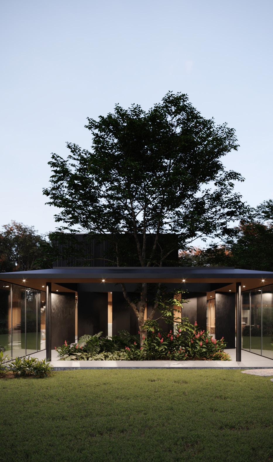 pavimento superior, com fechamento em brises metálicos, garante maior privacidade e discrição. Esse contraste entre o pavimento superior fechado e o térreo livre e transparente promove a sensação de leveza.