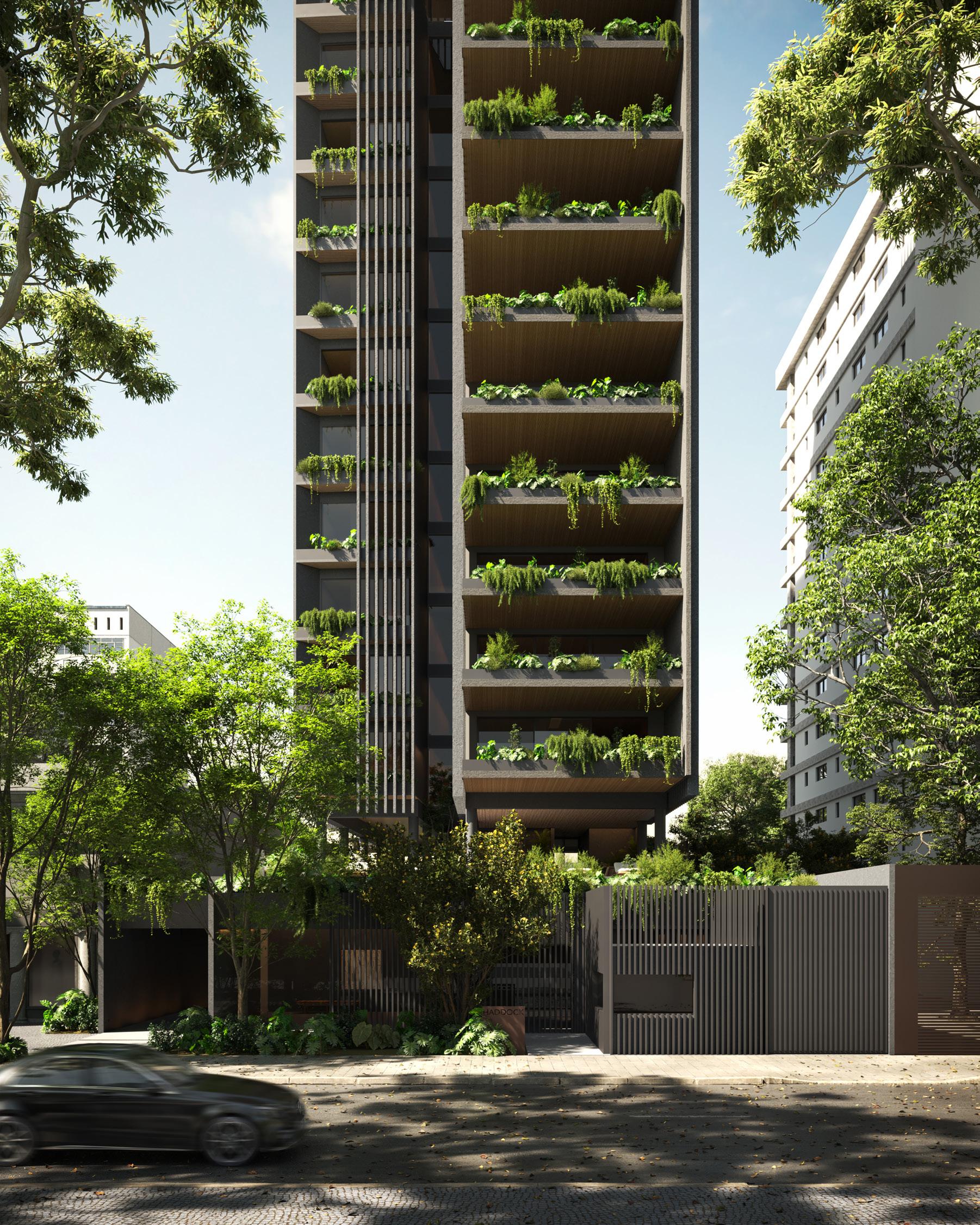 Ademais, a floreira adjacente à copa das árvores exerce papel de guardacorpo, se misturando ao bloco elevado.