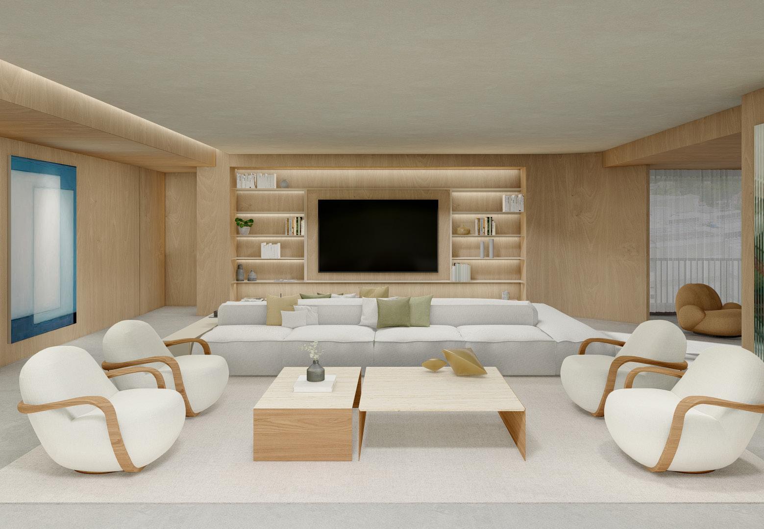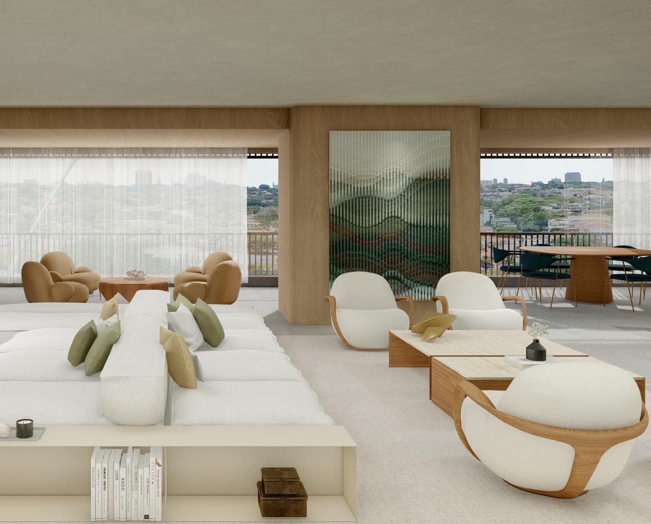 Localizado no bairro Pacaembu, em São Paulo, a cobertura apresenta vista privilegiada e tem como partido a sofisticação somada às necessidades do clientes relativas ao cotidiano da família, que inclui três crianças, e também os momentos de lazer com amigos e familiares. O uso da madeira traz aconchego aos diferentes ambientes e cria uma unidade entre as diferentes áreas sociais. A escolha de mobiliário e elementos em tons claros contempla o desejo do cliente em ter um espaço com uma atmosfera calma e elegante.