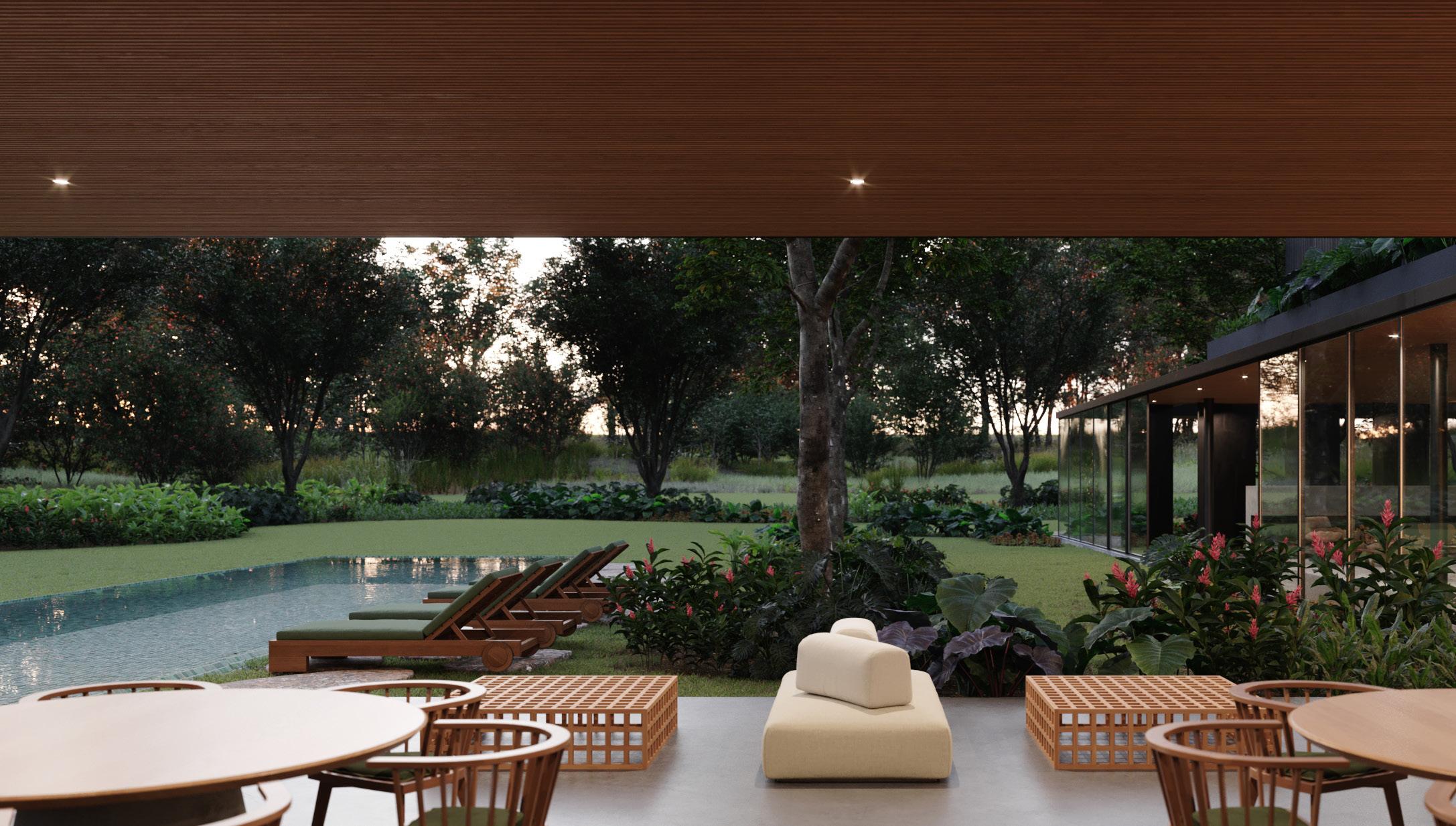 As áreas sociais são o destaque do projeto, sendo que no primeiro pavimento a sala de jantar e estar se integram a uma extensa varanda com vista para a cidade. O acesso ao segundo pavimento é feito por meio de uma escada escultural que leva diretamente ao espaço de maior programa social, contendo spa, piscina, salão de jogos, espaço kids, bar, home theater, gourmet com churrasqueira, copa de apoio e louceiro.