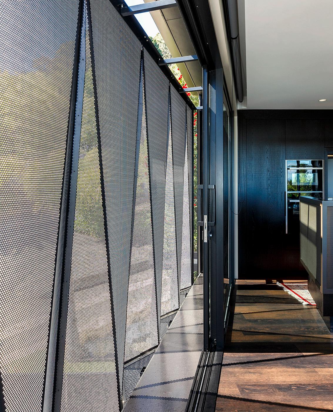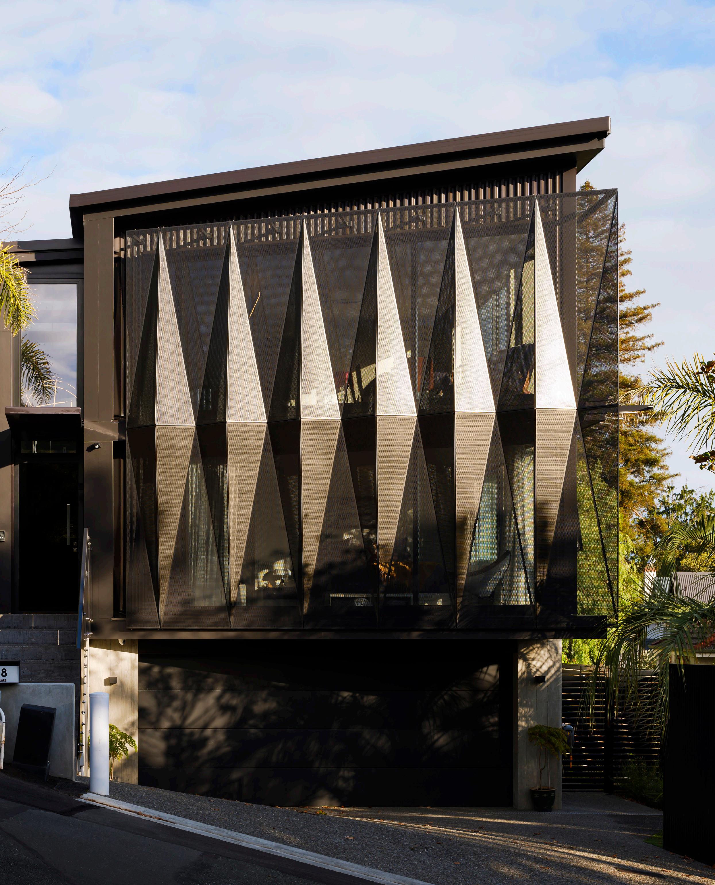 Arranged over three levels, the home’s clear zones take advantage of a northern aspect and views over the city. On the northern façade a folded, perforated screen provides shading and privacy, and doubles as a fall-protection barrier.