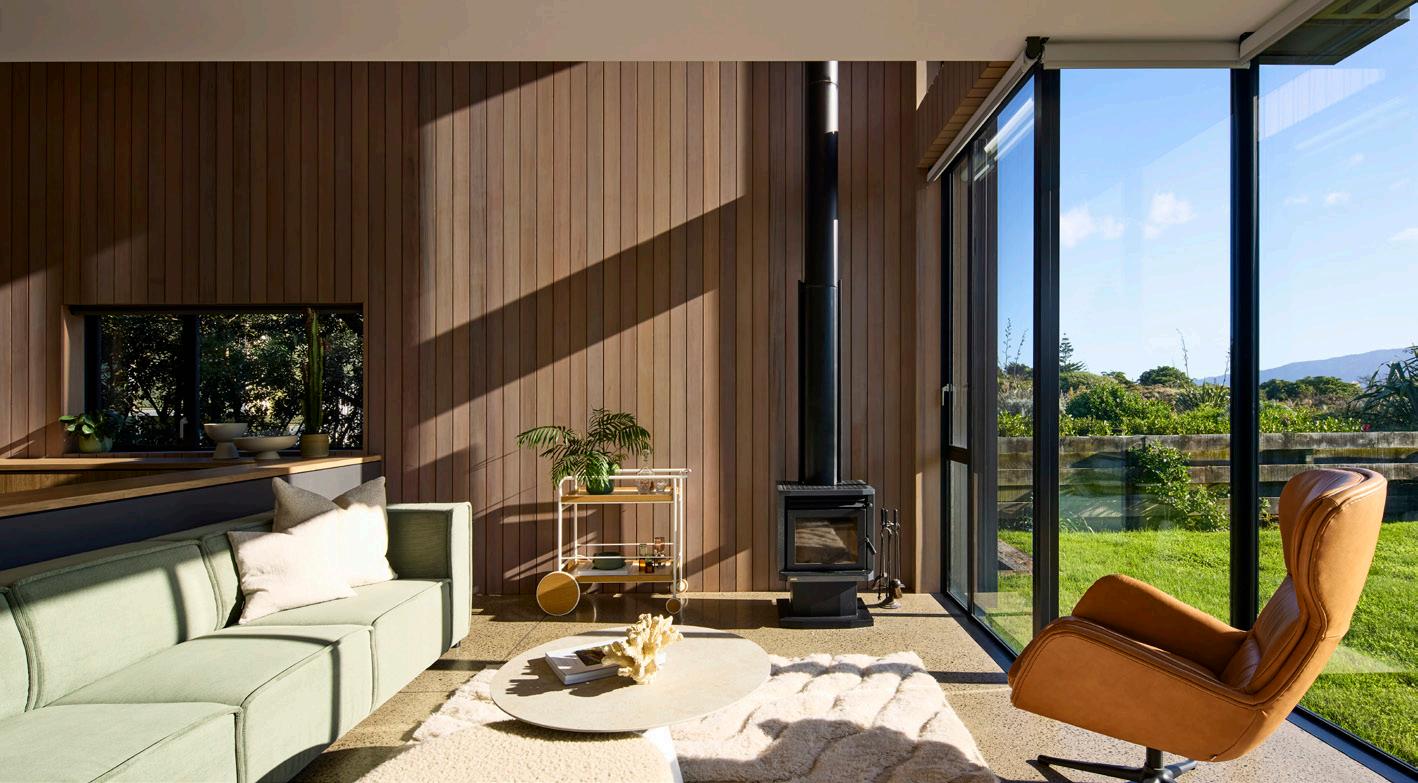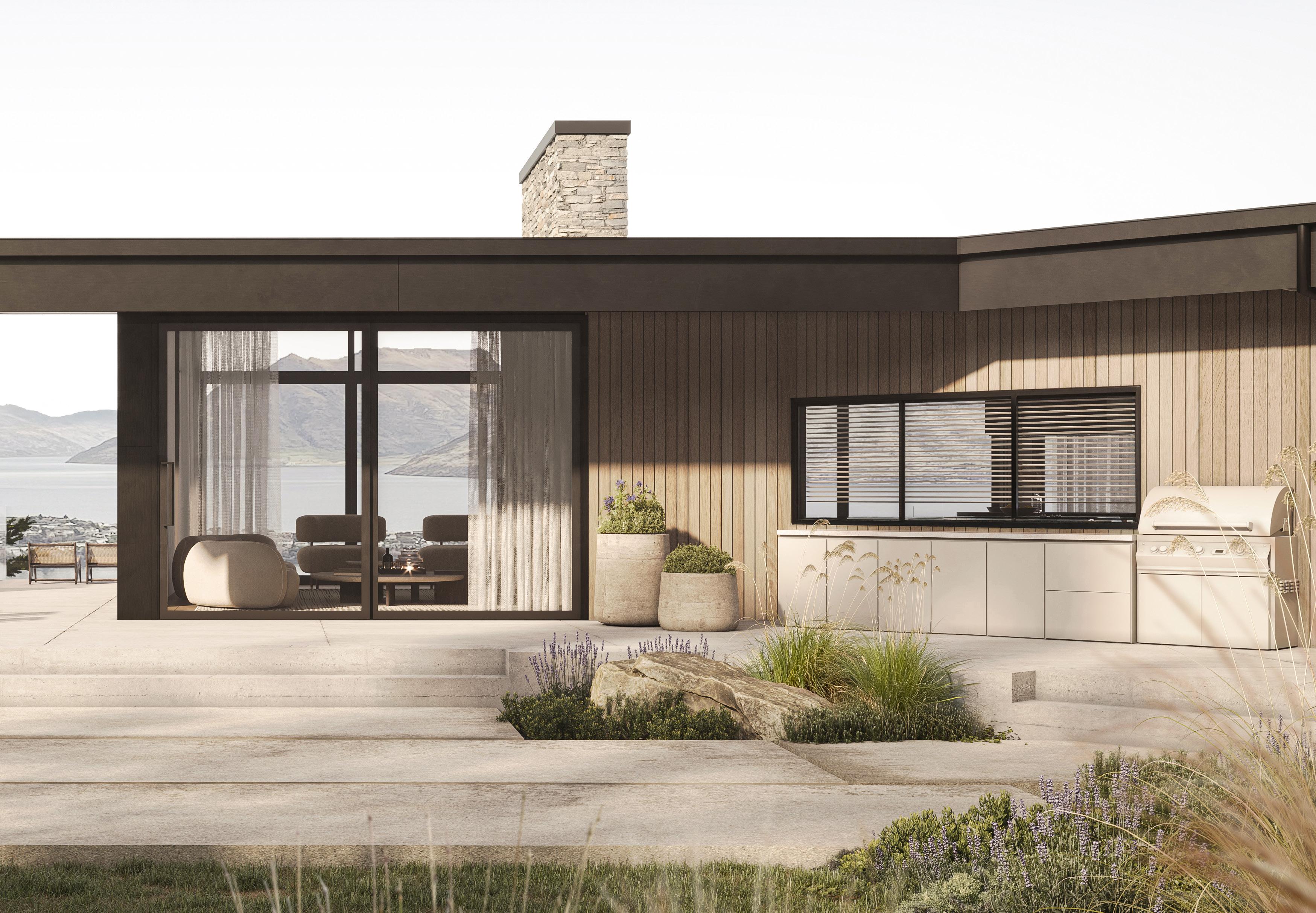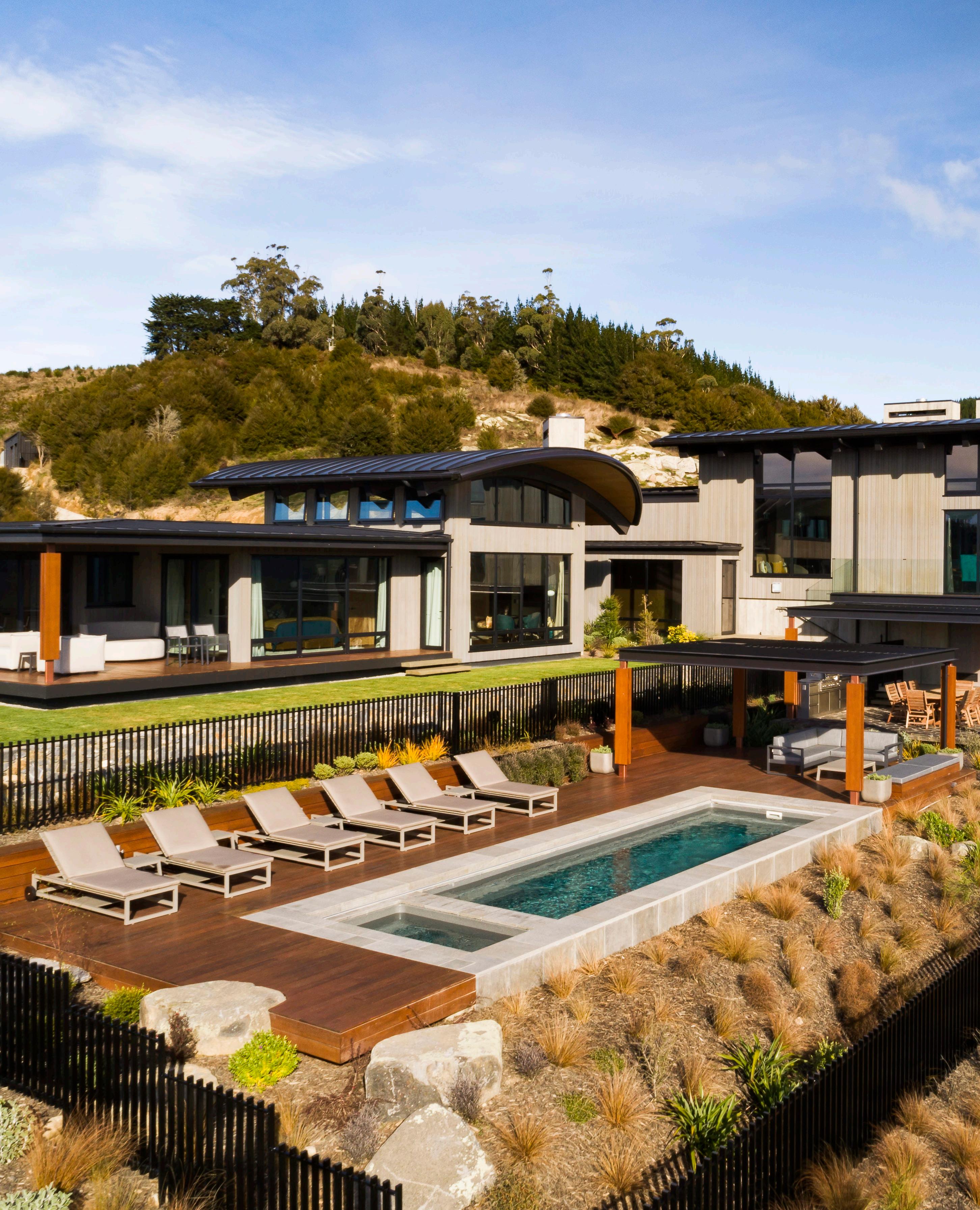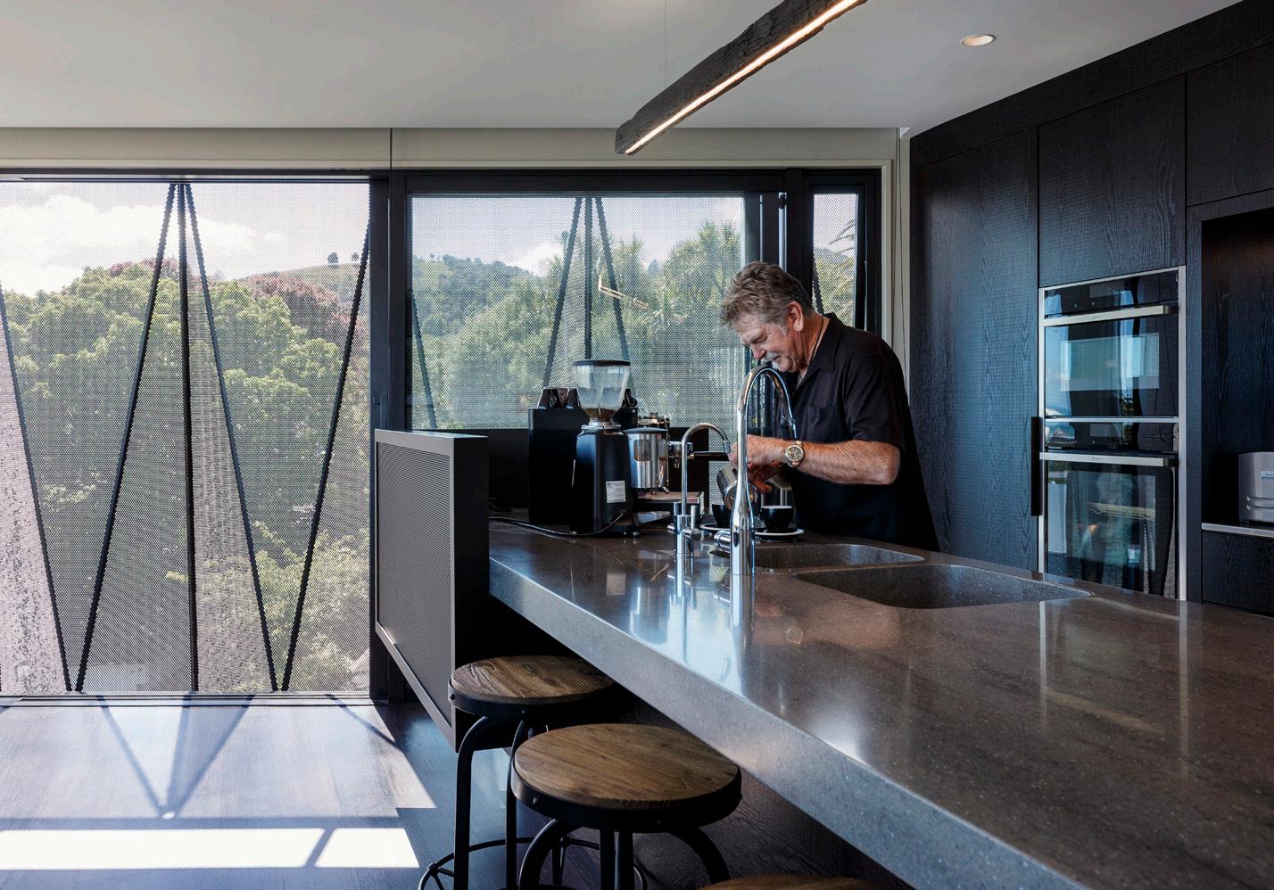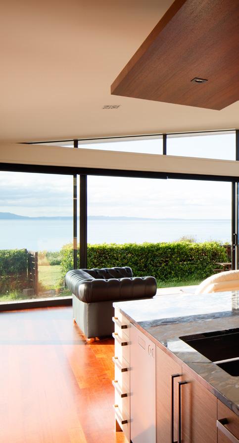 Local Marahau granite is used, reflecting the warm tones of the surrounding landscape, and complemented by timber ceilings that run throughout.
