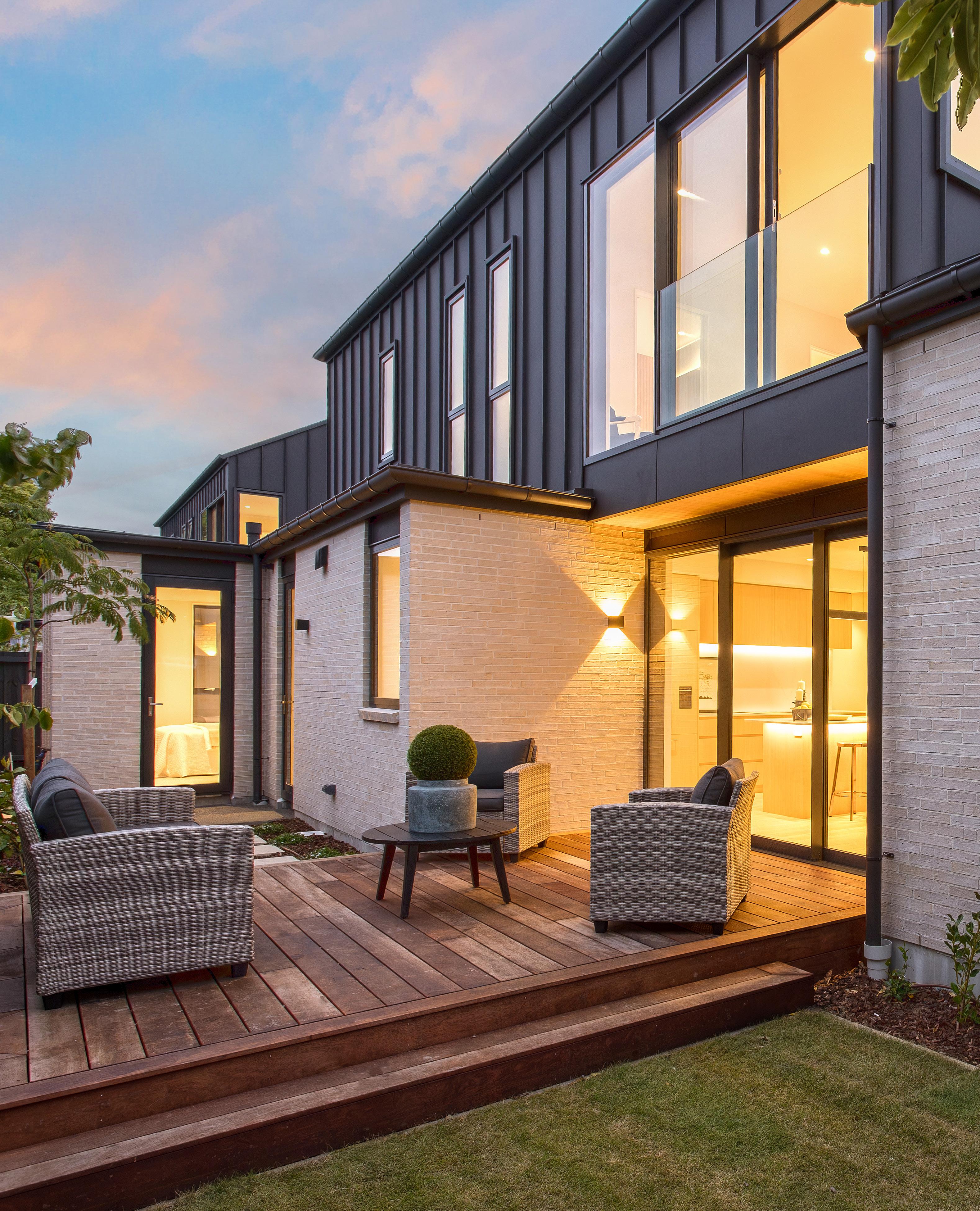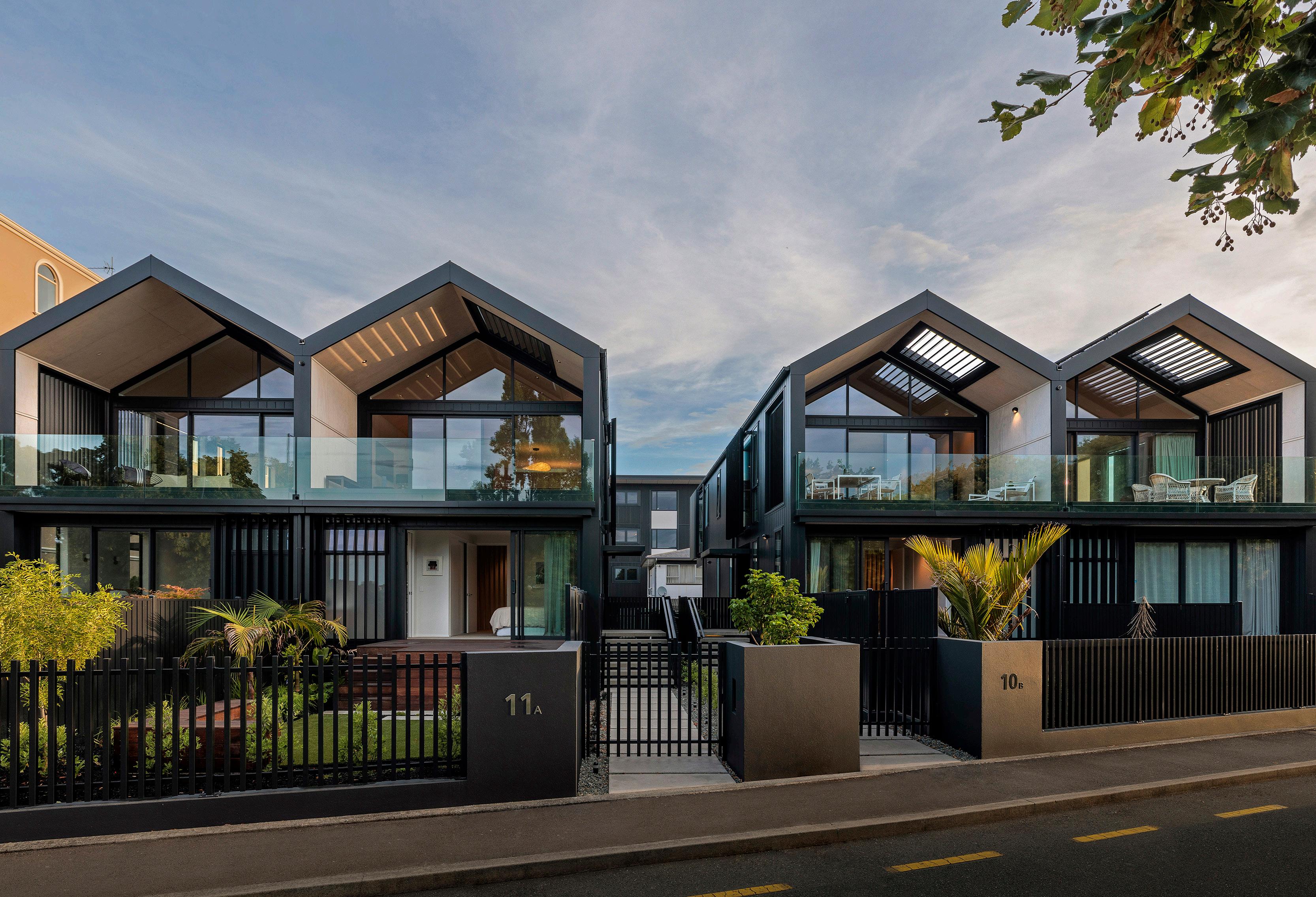 The townhouses are split into two by two unit blocks with a unified design approach to the create four architecturally continuous yet unique homes at the heart of Nelson city.
