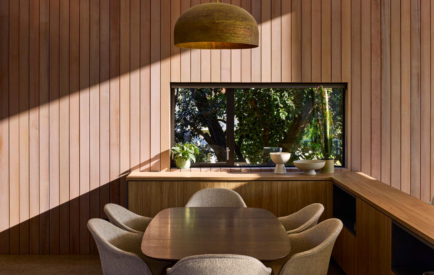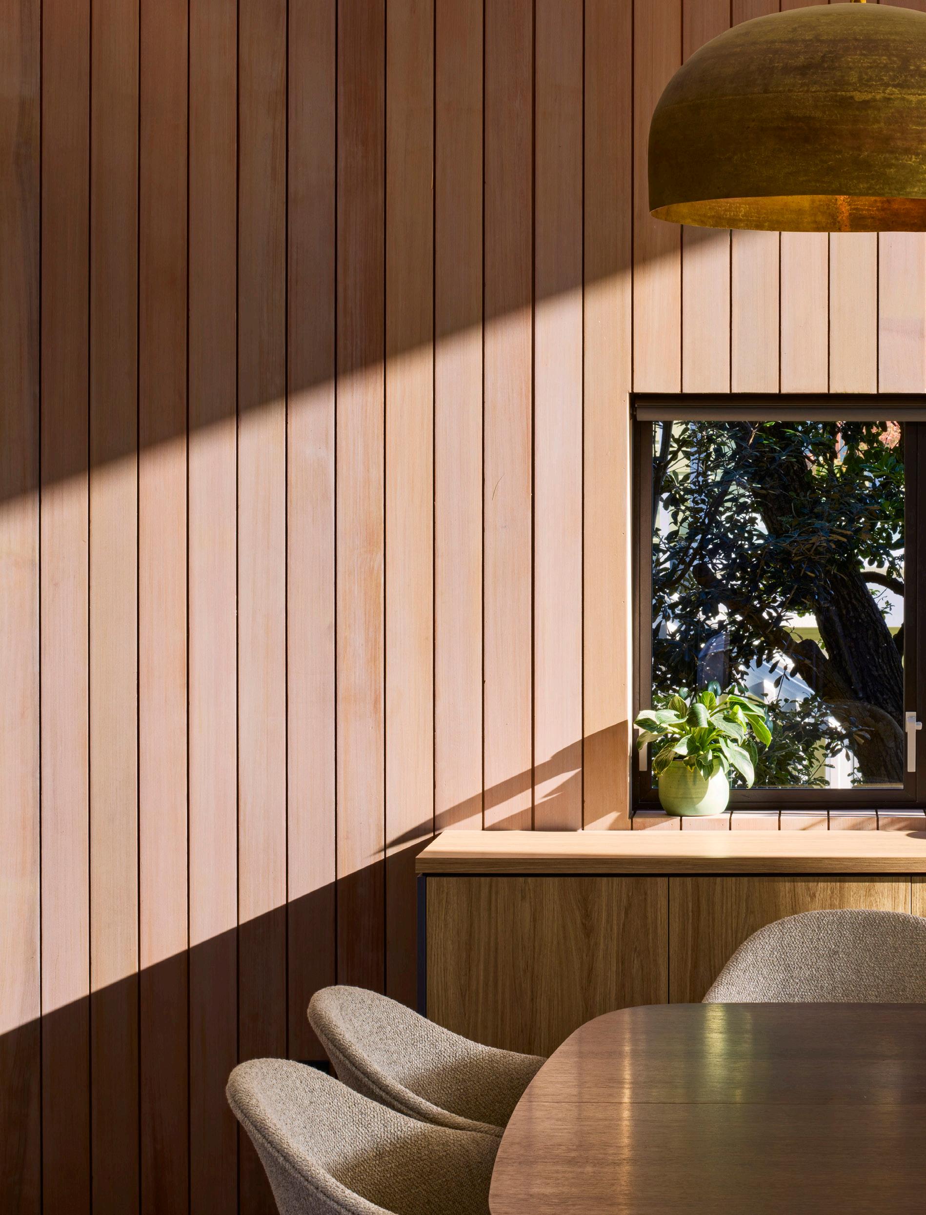 A natural timber palette reinforces this clarity. Vertical timber cladding,