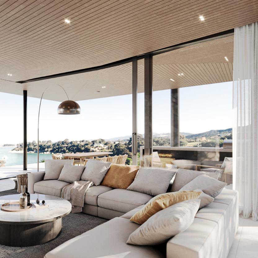 This contemporary residence is designed to embrace its surroundings with a light, refined material palette and a form that aligns with the spectacular views over Kaiteriteri Lagoon. The architectural vision focuses on creating a seamless relationship between indoor living and the natural environment, celebrating both coastal tranquillity and modern design clarity.