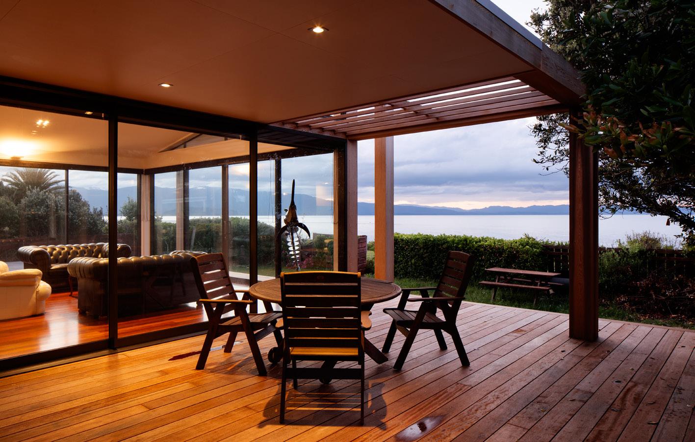 Oiled cedar cladding in its greyed form reflects the soft grey bark of the re-vegetated Manuka which surrounds the property, and extensive kwila decking wraps around the villa, connecting private and shared spaces.