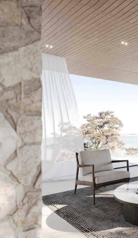 multigenerational living. Material selections reflect the coastal environment and the desire for refined, enduring finishes. Natural sandstone cladding brings warmth and durability, complemented by vertical timber weatherboards for softness and texture. Aluminium elements ensure resilience in a marine climate while maintaining a clean, contemporary aesthetic.