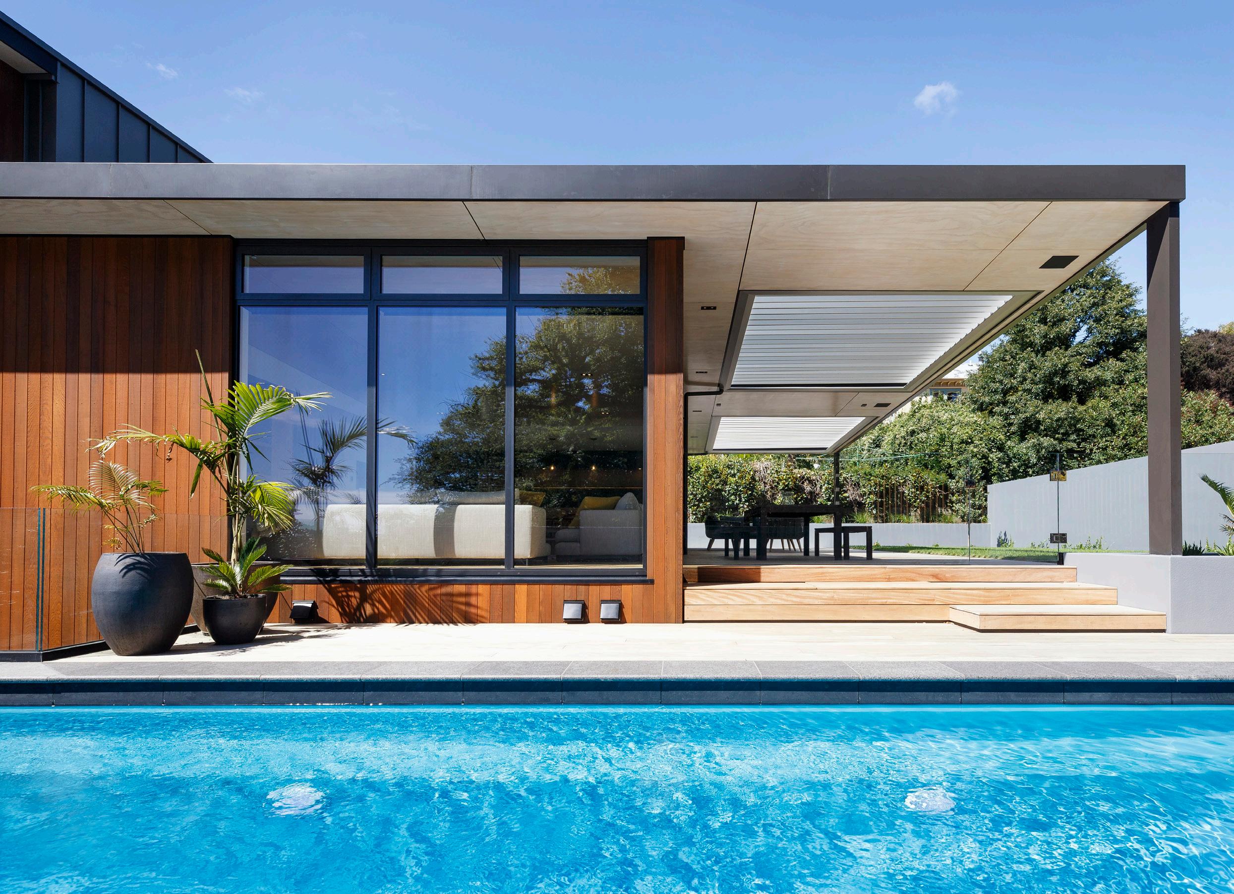 A generously proportioned covered outdoor space, complete with an outdoor fire and adjustable horizontal and vertical louvres, offers a year-round area that connects directly to the kitchen.