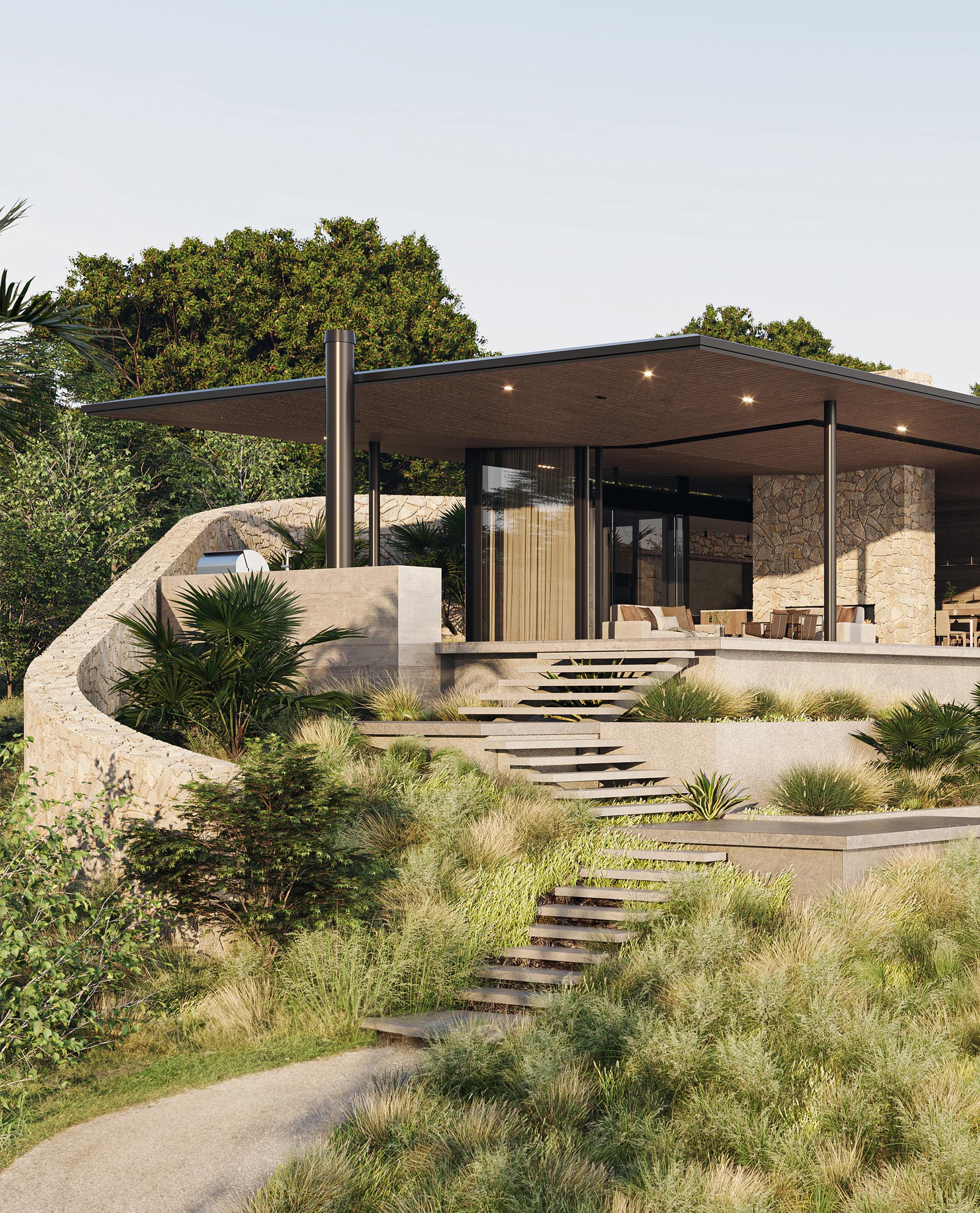 The house is characterised with a stone wall at the arrival court, which organically curves away from the building, providing a sheltered north facing outdoor living area with kitchen, dining areas and landscaped access to the swimming pool.