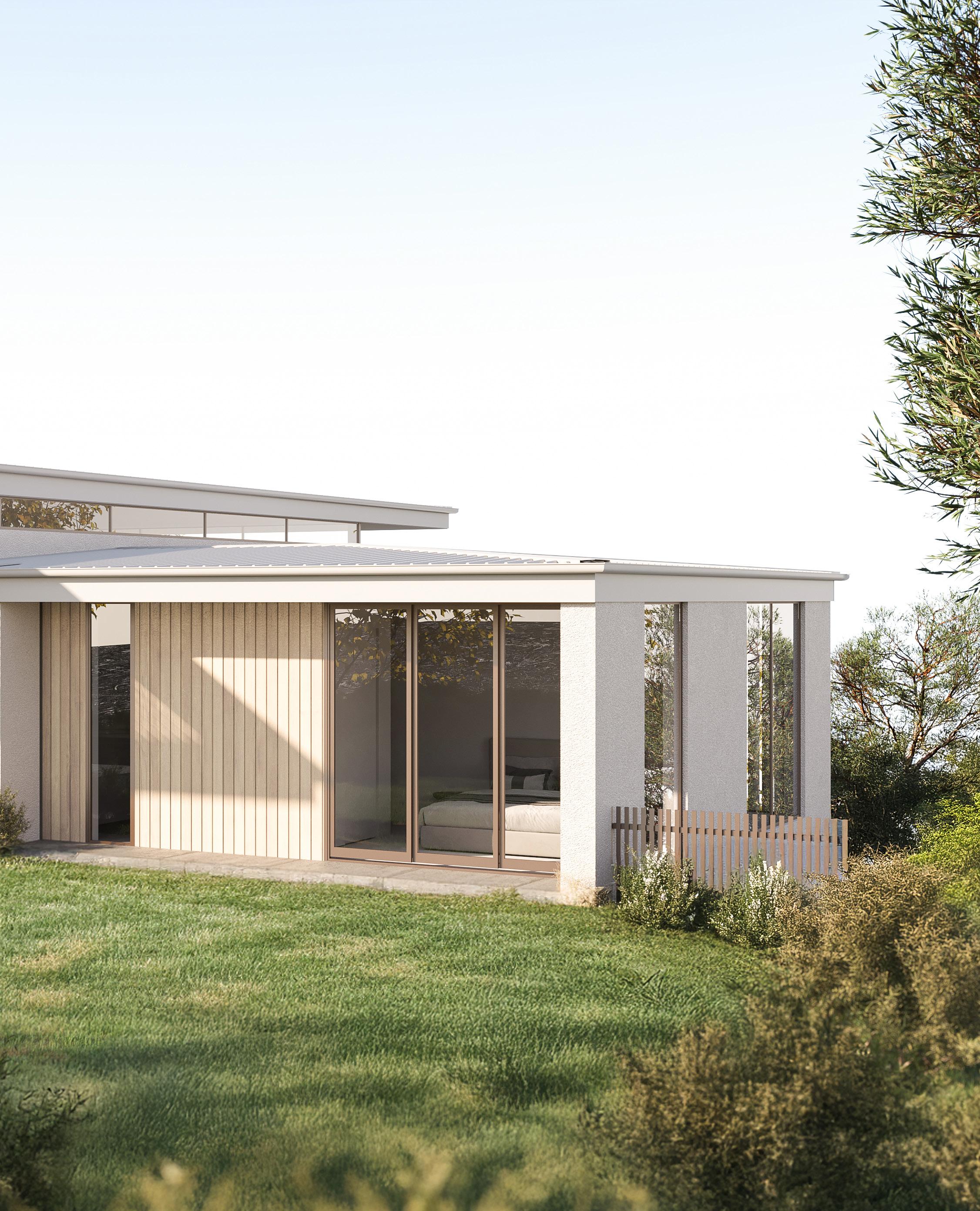 The exterior features a blend of soft colour and material palette, chosen to reflect the lighter tones of the coastal setting while providing warmth, texture, and
