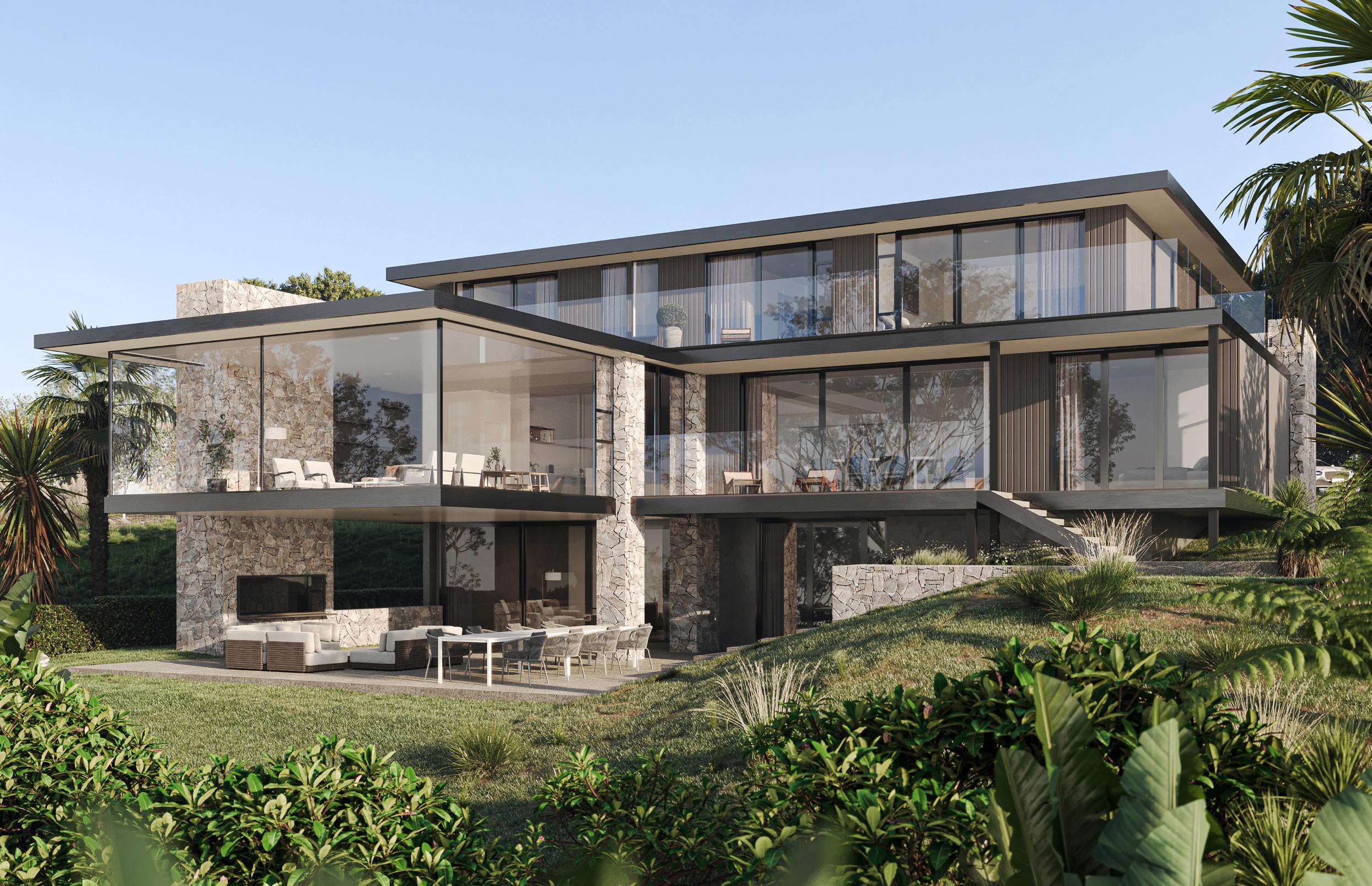 The architectural language combines vertical timber cladding, extensive floor to ceiling glazing, and a refined, earthy palette, creating a residence that feels both grounded in its environment and strikingly contemporary.