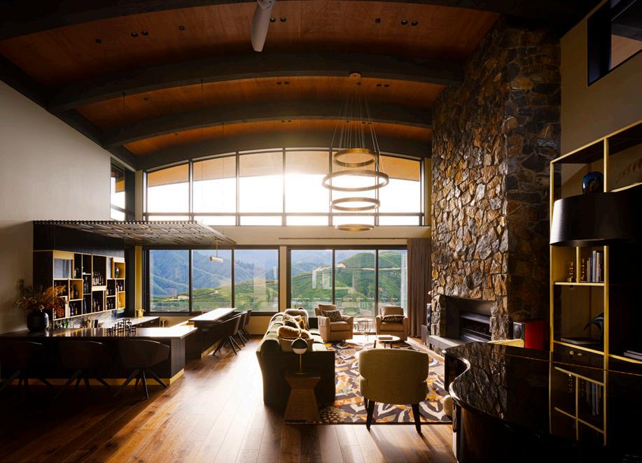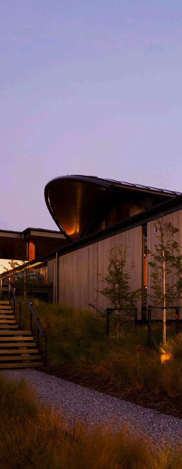 The ‘falcon’ in the name resonates through curved elliptical falconwing roofs which are a feature of this highly bespoke building. The steelwork was rolled in Wellington, then shipped to Nelson. Each roof frame was set up in Sharland Engineering in Nelson, then disassembled, painted and reassembled on site. Extensive planning went into the structure and layout of the lodge, including materials used to connect the villa to the land – this includes the use of local lee valley rock in the terracing which anchors the building among the existing rock outcrops.
