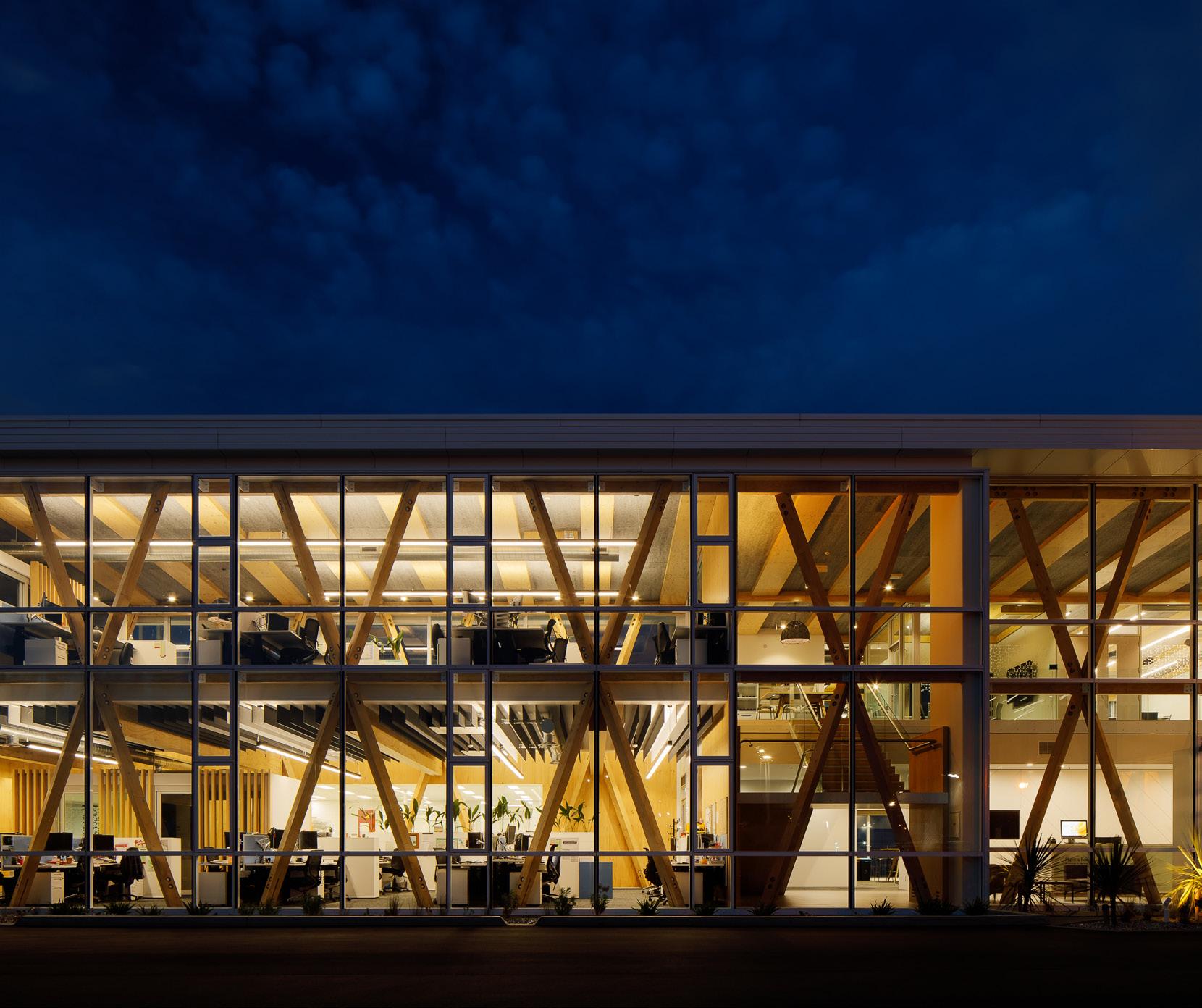 The building incorporates a combination of timber and steel elements, and utilises innovative XLam cross laminated timber for large portions of the structure and interior linings. Externally the building is clad in a combination of cedar and fibre cement sheets with large areas of high performance glazing..