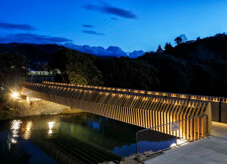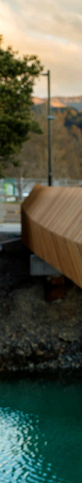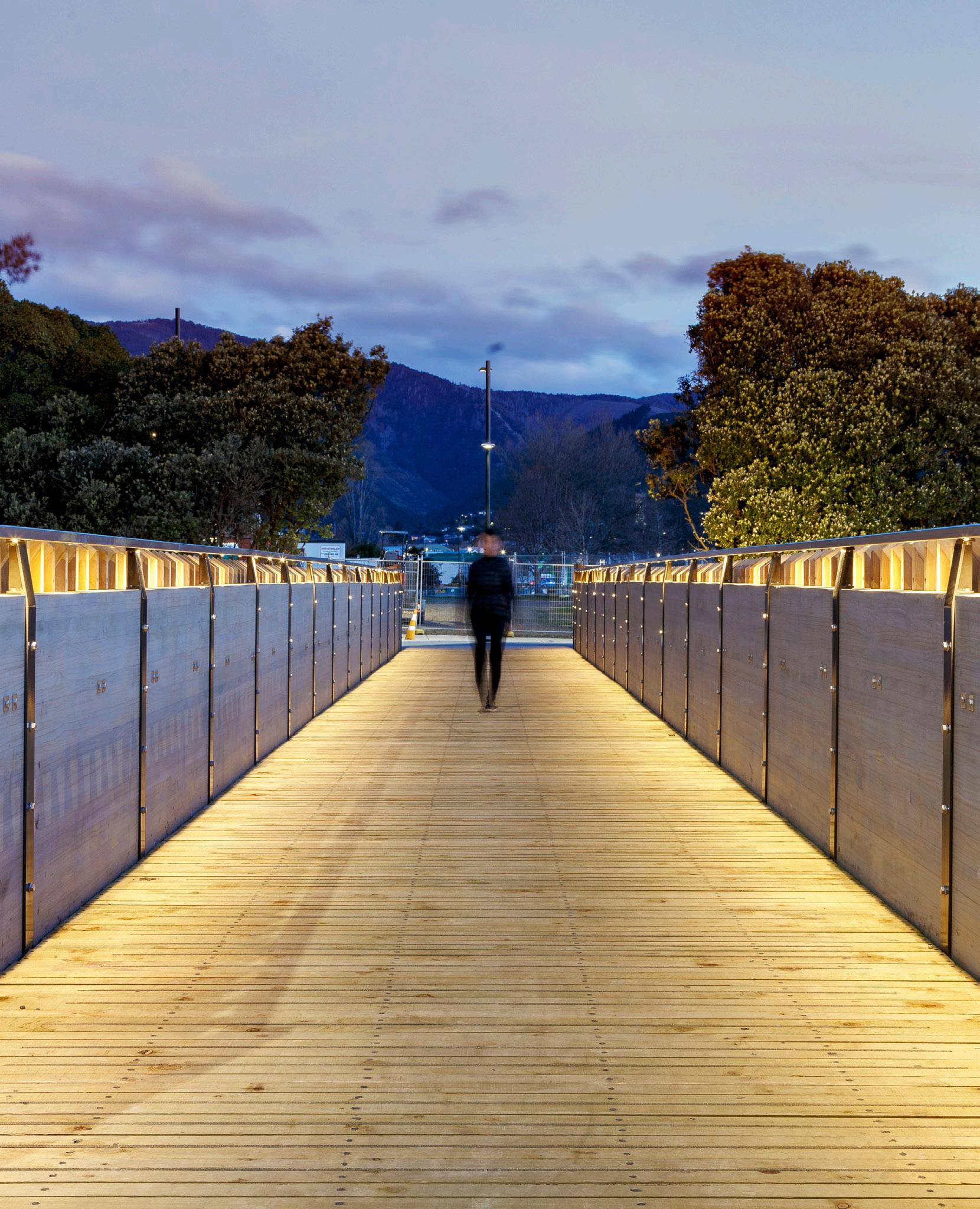 The site is an early landing for local Iwi, and this is echoed through the form of the bridge, which reflects the shape of a Waka hull. The structural design is based on a traditional German Trog Brücke (trough/open bridge) relying on glulam beams either. The bridge was prefabricated off site and lifted into place, which minimised disruption to the riverside walkways and avoided the need for midstream supports that may have impacted on the river bed and ecology.