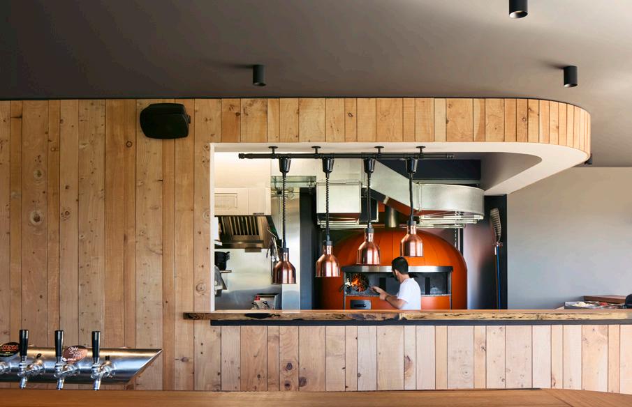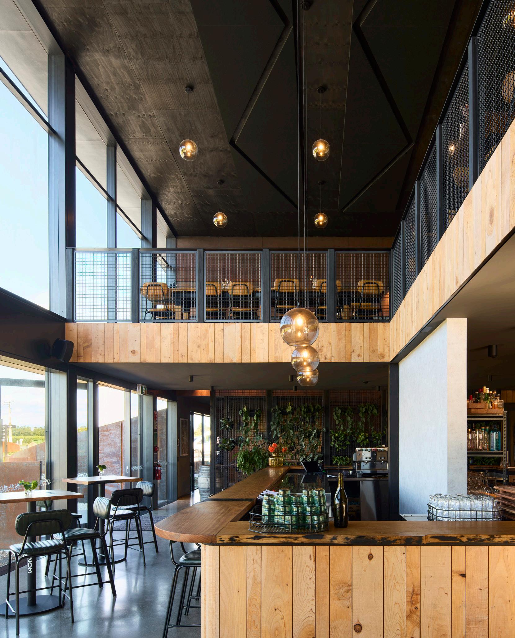 For the interior, Himalayan cedar panelling from timber felled on the owner’s property, tables are from live-edge flitches of gum, and sheet boarding is painted with paint incorporating iron filings produce a rusted earth effect.