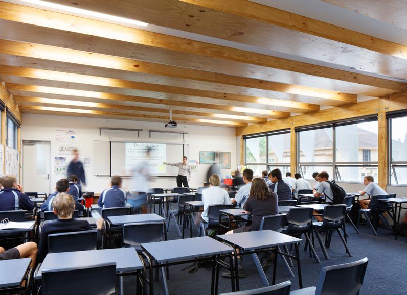 Whilst the exterior of the building is simple and efficient, it is articulated with the sculptural folded sunscreens and a generous canopy to provide shelter and identify the entrance. The construction uses locally sourced light weight LVL and prefabricated timber elements throughout and was accepted as a stage one finalist for Engineering Innovation and Excellence in Engineered Wood Products in the NZ Wood Resene Timber Design Awards for 2017.