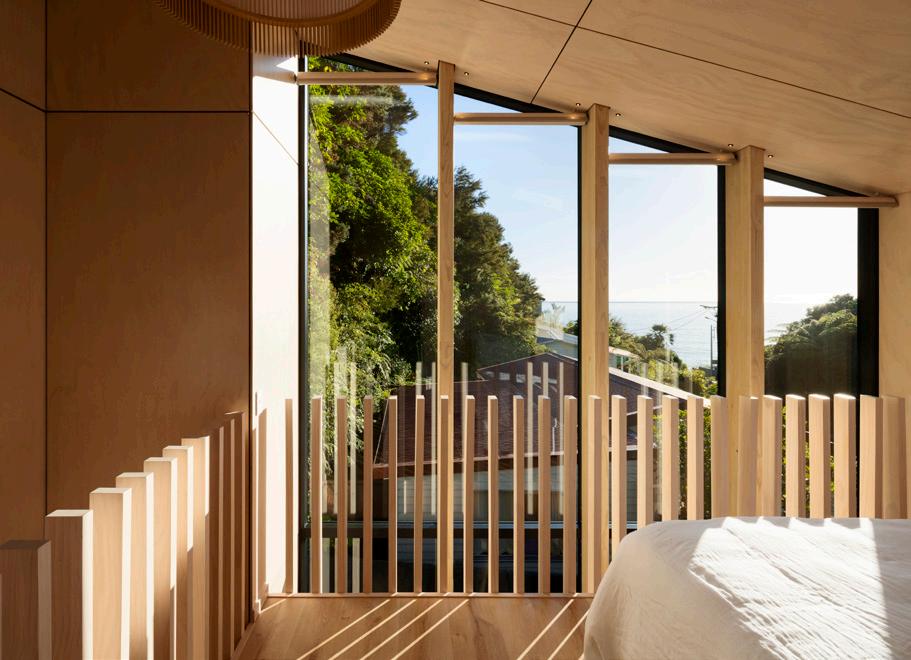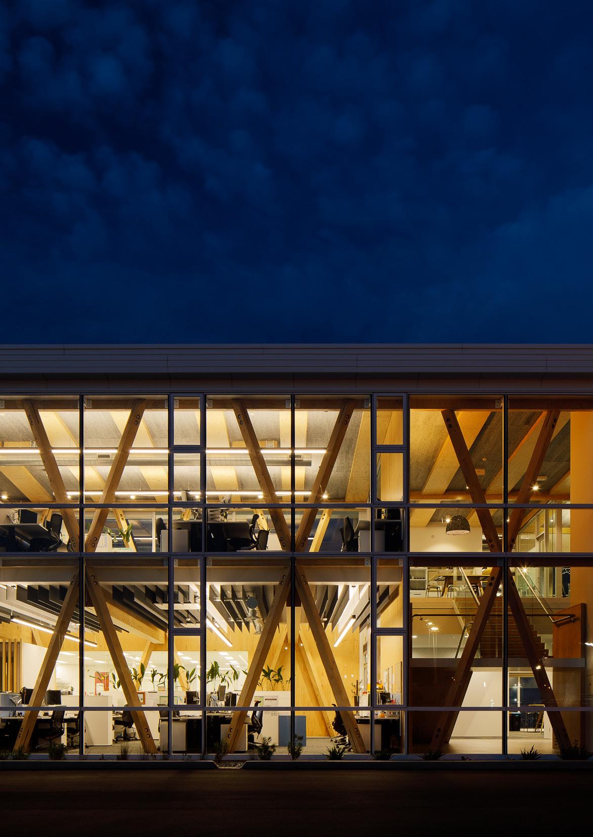 The main structure is expressed locally sourced (less than 100km) mass timber featuring a high level of prefabricated timber elements, including XLAM timber shear walls, LVL cross columns for lateral bracing, Poitus LVL flooring and roof components. Bound on water by three sides, the building is aluminium clad to provide a robust and durable exterior in this harsh marine environment.