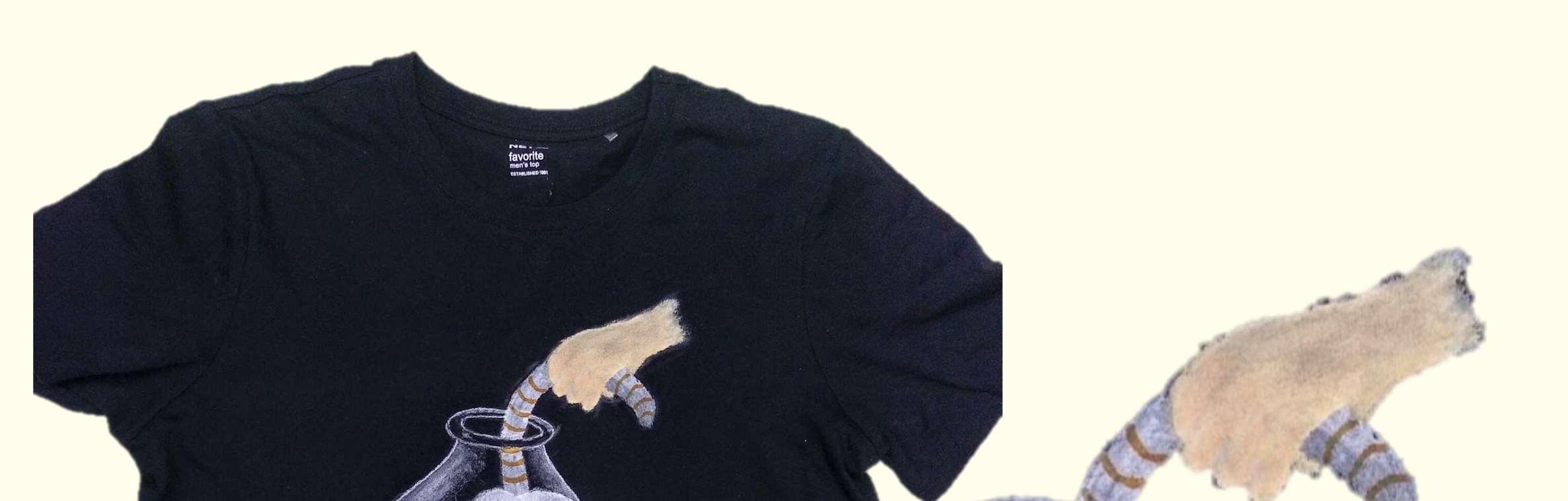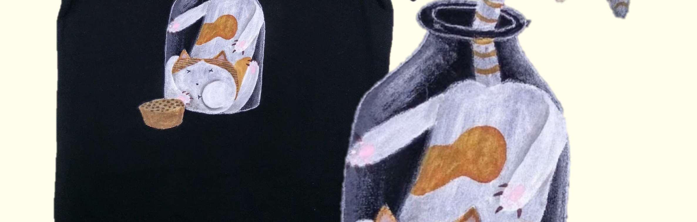 使用壓克力顏料在衣服上作畫,以漫畫風格繪製瓶中被擠壓的花貓。