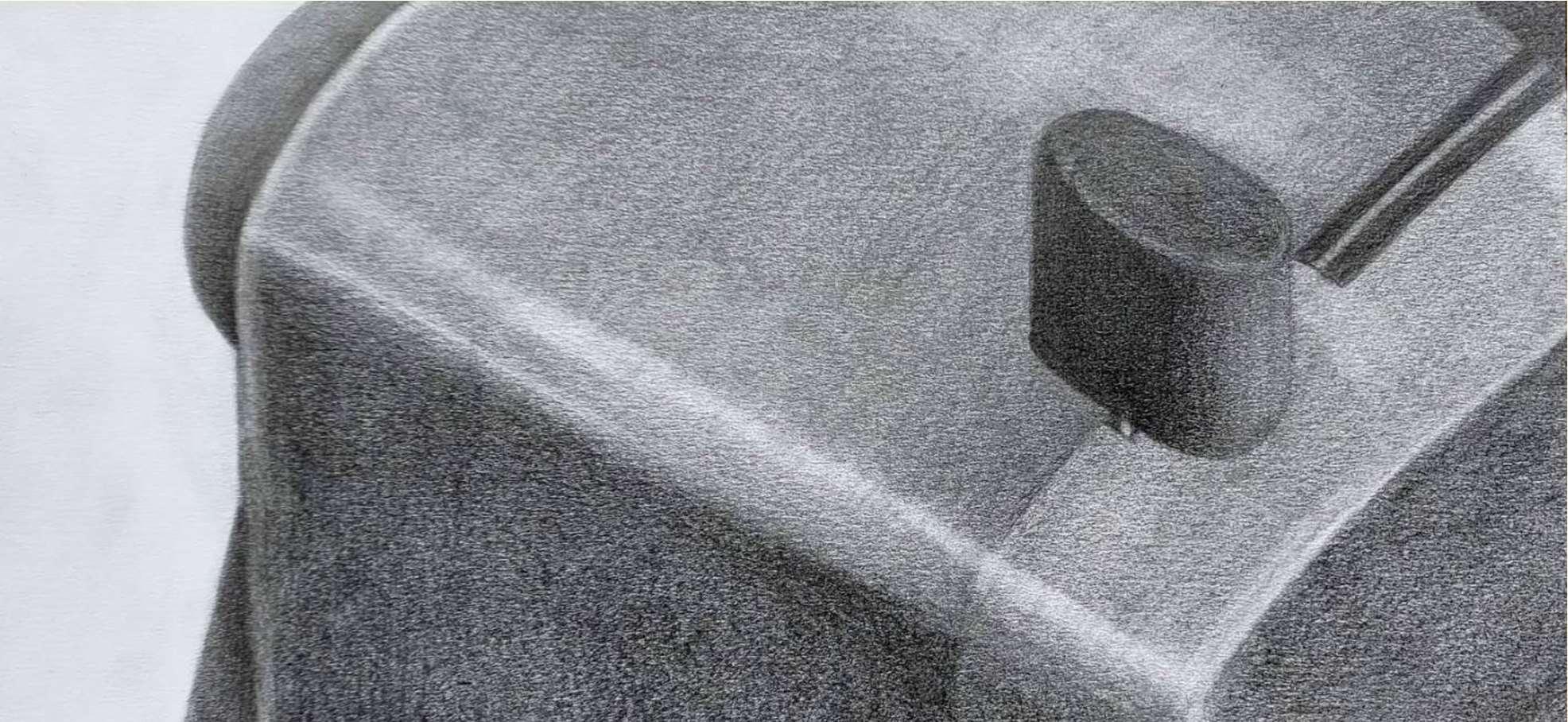 一張將削鉛筆機放到極大,只描繪它的特點,另一張則是將它縮小, 放置在一個空間中,展現對比的效果與不同的氛圍。