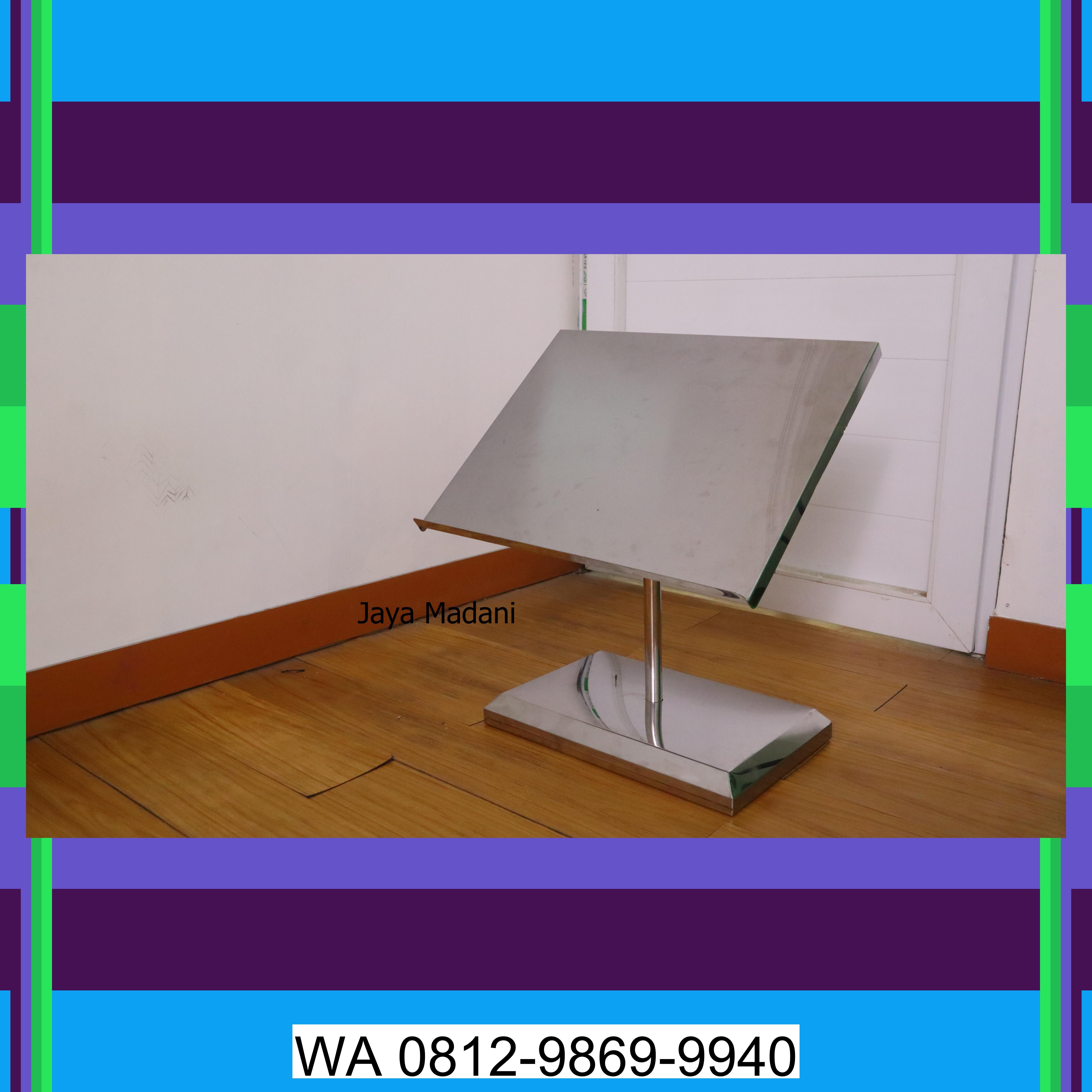 Standing Al-Qur'an berbahan stainless steel dengan desain modern dan elegan, dirancang untuk memudahkan berbagai kegiatan ibadah Anda.