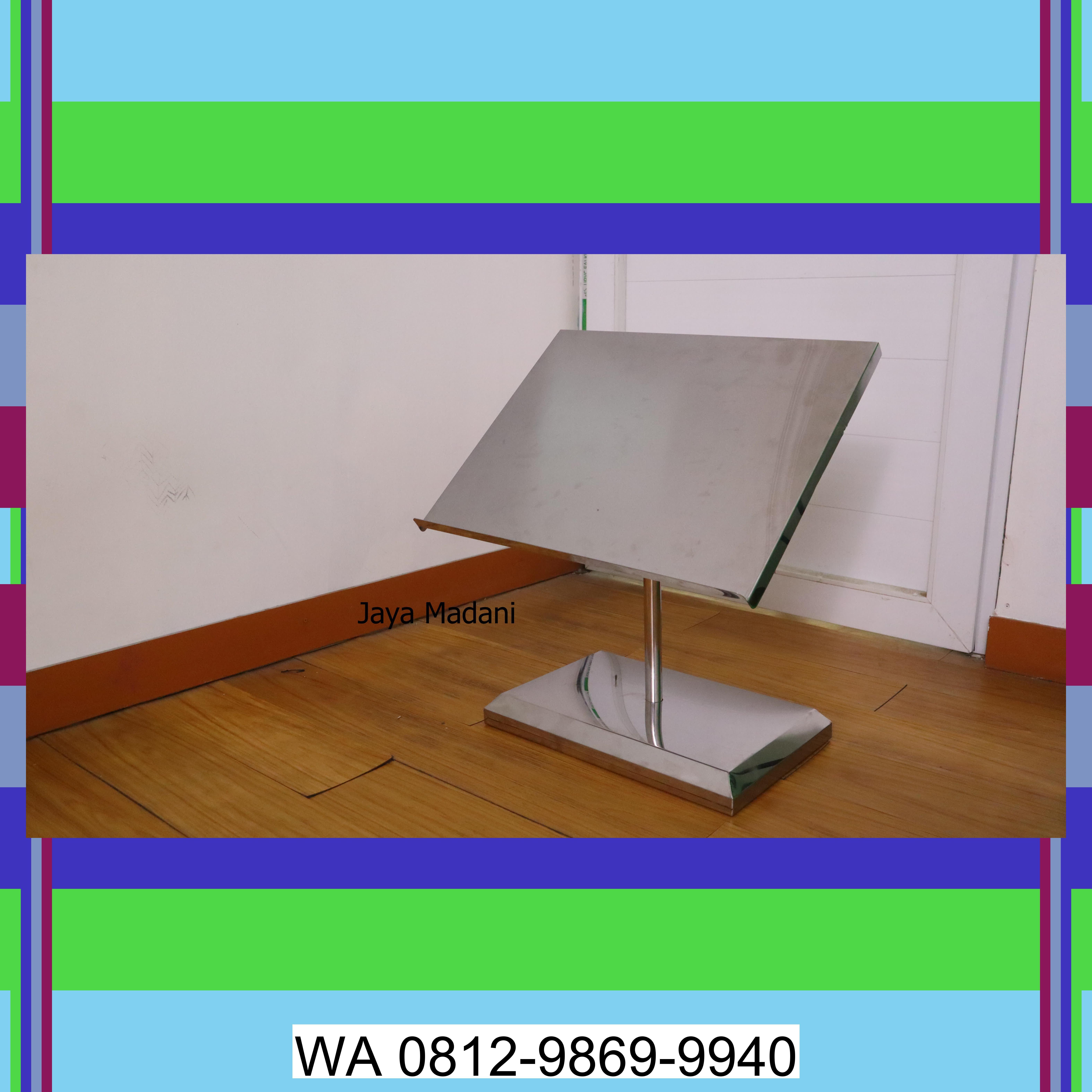Standing Al-Qur'an berbahan stainless steel dengan desain modern dan elegan, dirancang untuk memudahkan berbagai kegiatan ibadah Anda.
