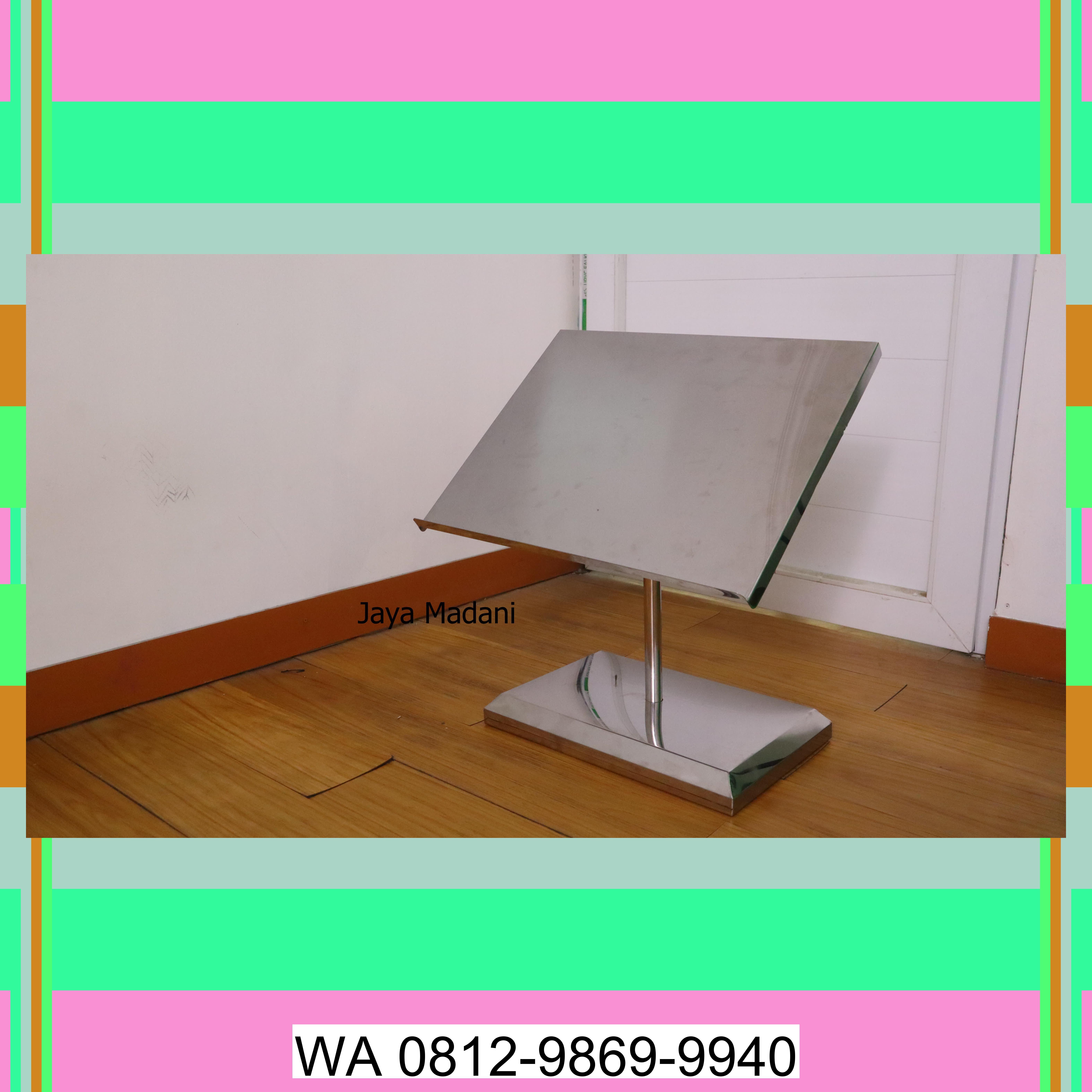Standing Al-Qur'an berbahan stainless steel dengan desain modern dan elegan, dirancang untuk memudahkan berbagai kegiatan ibadah Anda.