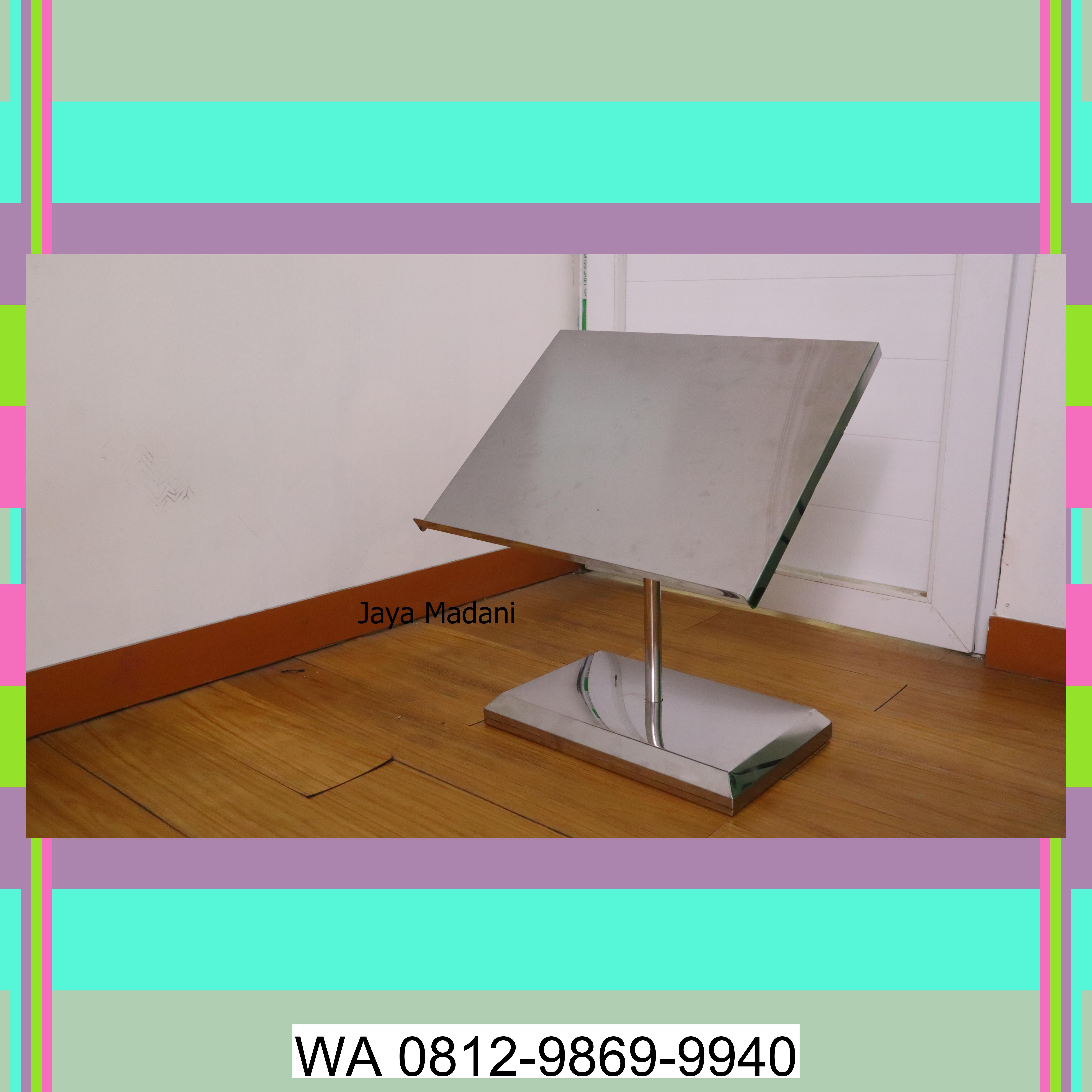 Standing Al-Qur'an berbahan stainless steel dengan desain modern dan elegan, dirancang untuk memudahkan berbagai kegiatan ibadah Anda.