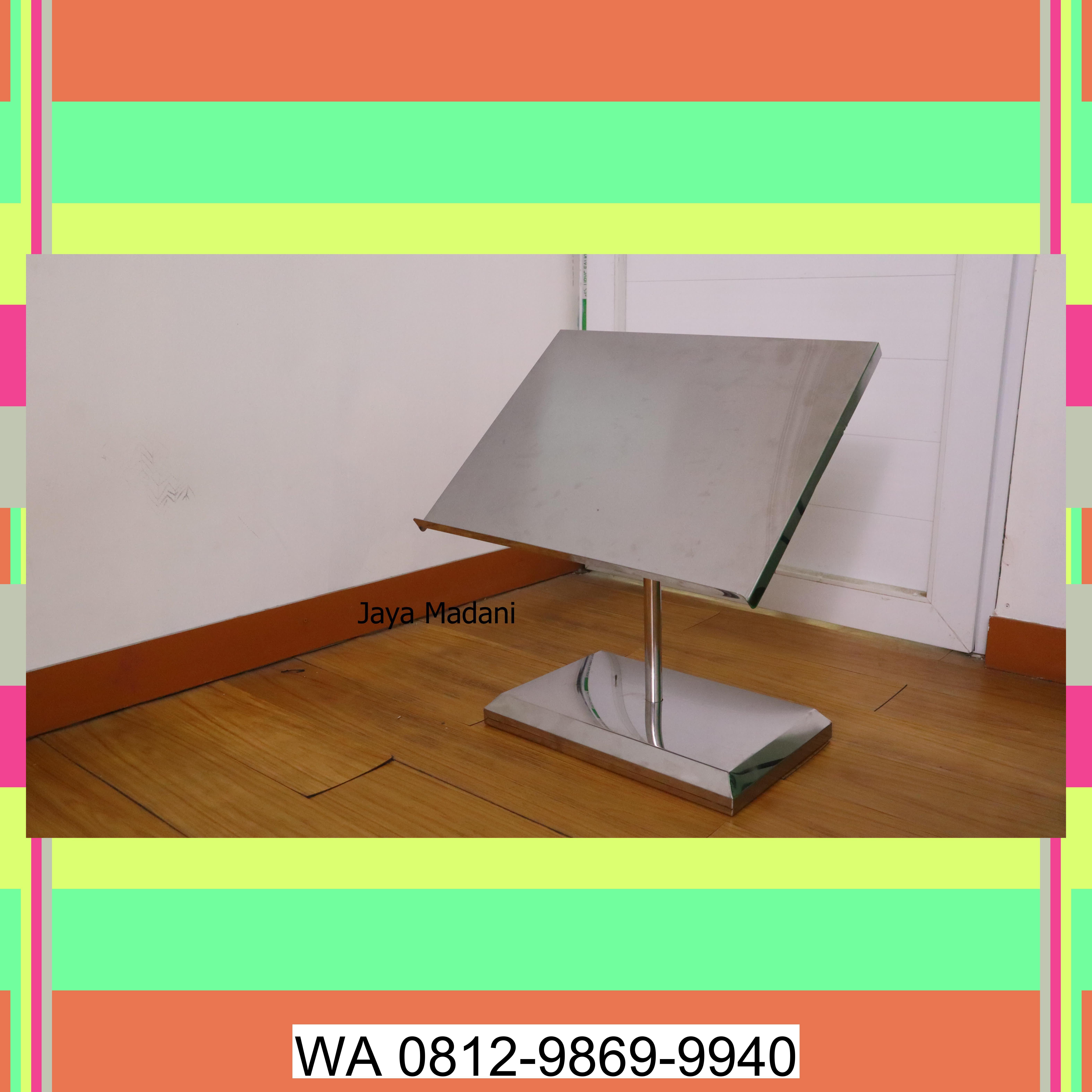 Standing Al-Qur'an berbahan stainless steel dengan desain modern dan elegan, dirancang untuk memudahkan berbagai kegiatan ibadah Anda.