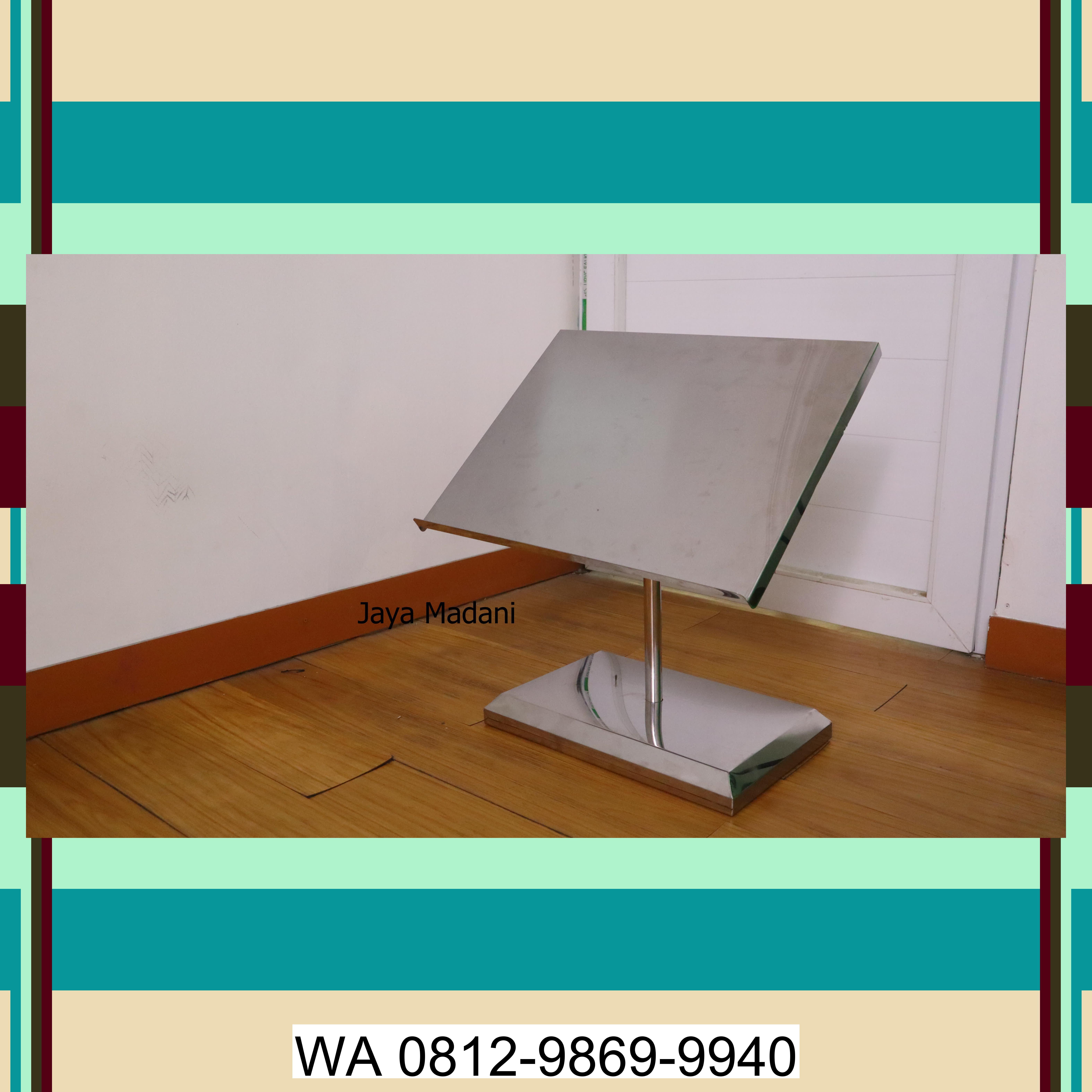 Standing Al-Qur'an berbahan stainless steel dengan desain modern dan elegan, dirancang untuk memudahkan berbagai kegiatan ibadah Anda.