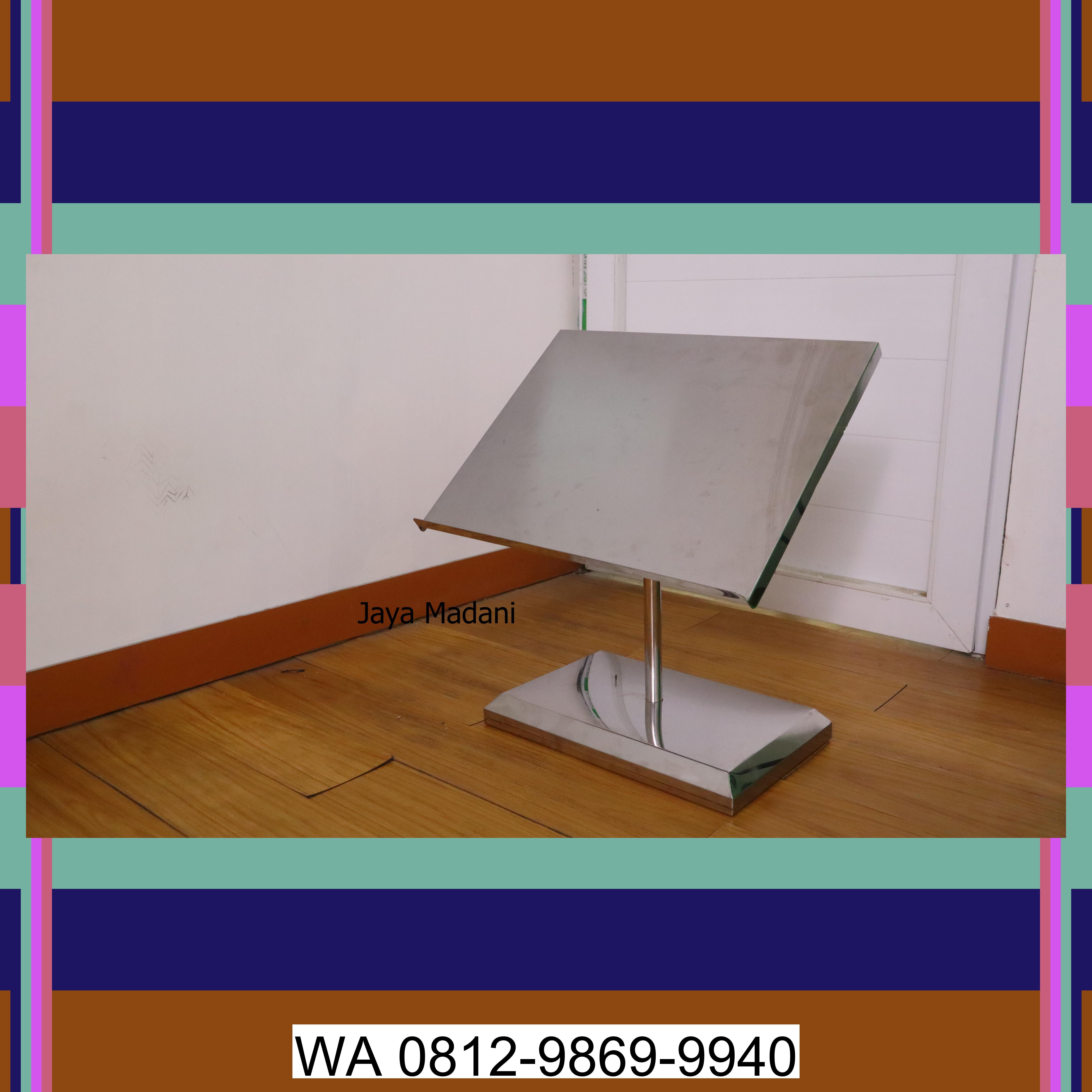 Kami menawarkan Jual Stand Qur'an / Stand Al-Qur'an / Stand Holder Al-Qur'an terbaik di Wonggeduku.<br><br>Standing Al-Qur'an berbahan stainless steel dengan desain modern dan elegan, dirancang untuk memudahkan berbagai kegiatan ibadah Anda.<br><br>Spesial untuk Anda: Manfaatkan sekarang juga! Dapatkan Jual Stand Qur'an / Stand Al-Qur'an / Stand Holder Al-Qur'an dengan harga yang tidak akan Anda temukan di tempat lain. Kami yakin Anda tidak akan menyesal memilih kami. Hubungi kami sekarang di 0812-9869-9940 untuk informasi lebih lanjut atau kunjungi kami di Wonggeduku.<br><br>Juga tersedia: Stand Menu | Tempat Menu | Stand Rak Menu Buku Menu Restoran | Stand Holder Menu Resto, Tempat Majalah rak koran stainless steel, Rak Payung | Tempat Payung | Rak Tempat Stand Payung | Lemari Payung, Troli Pengumpulan Piring Kotor Serbaguna, Troli Saji Serbaguna, Troli Hotel Roda 8in Luggage Cart, Keranda Jenazah Portable Stainless, Trolly laundry, troli linen hotel, Tempat Mandi jenazah dan tenda pemandian mayat, Paketan