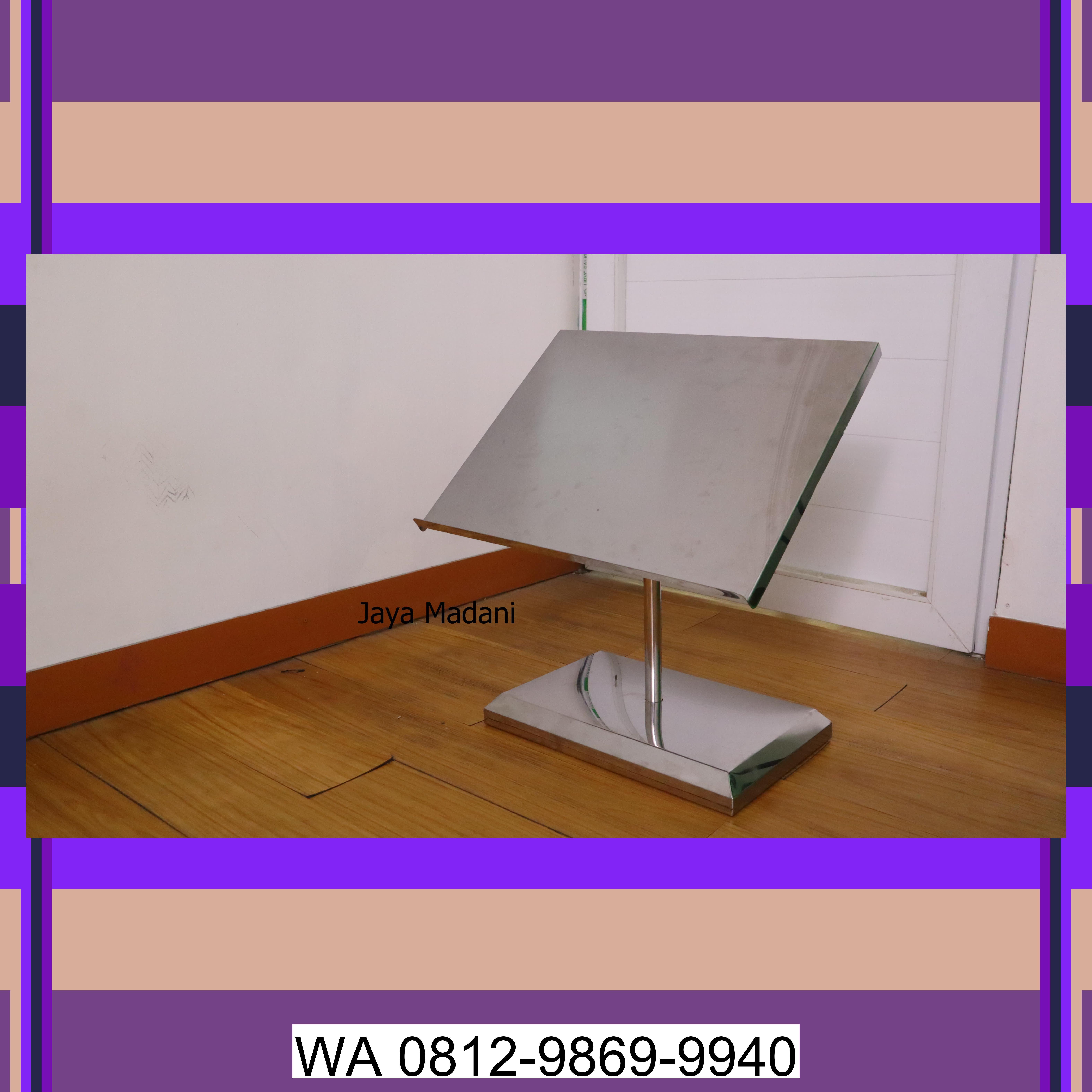 Standing Al-Qur'an berbahan stainless steel dengan desain modern dan elegan, dirancang untuk memudahkan berbagai kegiatan ibadah Anda.