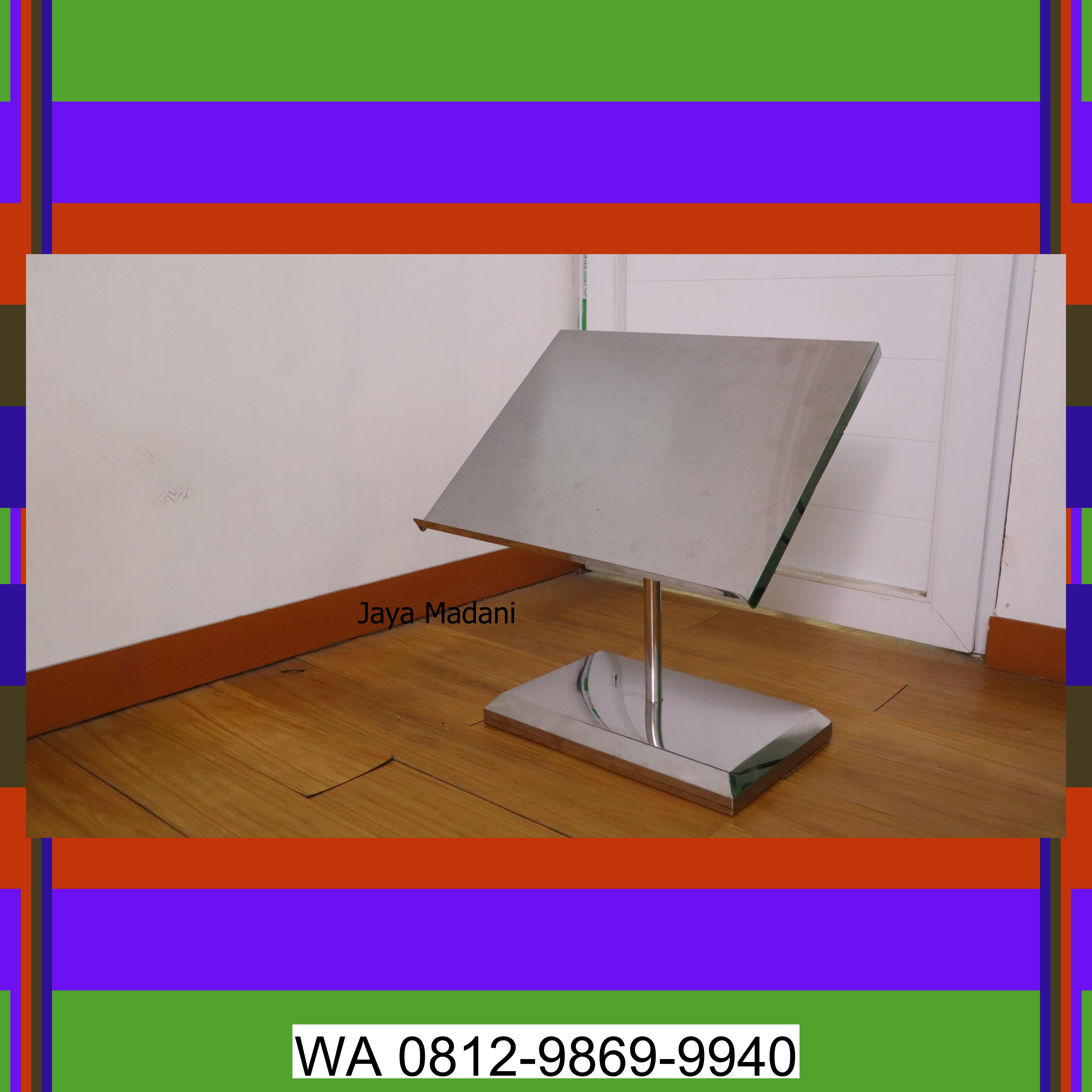 Standing Al-Qur'an berbahan stainless steel dengan desain modern dan elegan, dirancang untuk memudahkan berbagai kegiatan ibadah Anda.