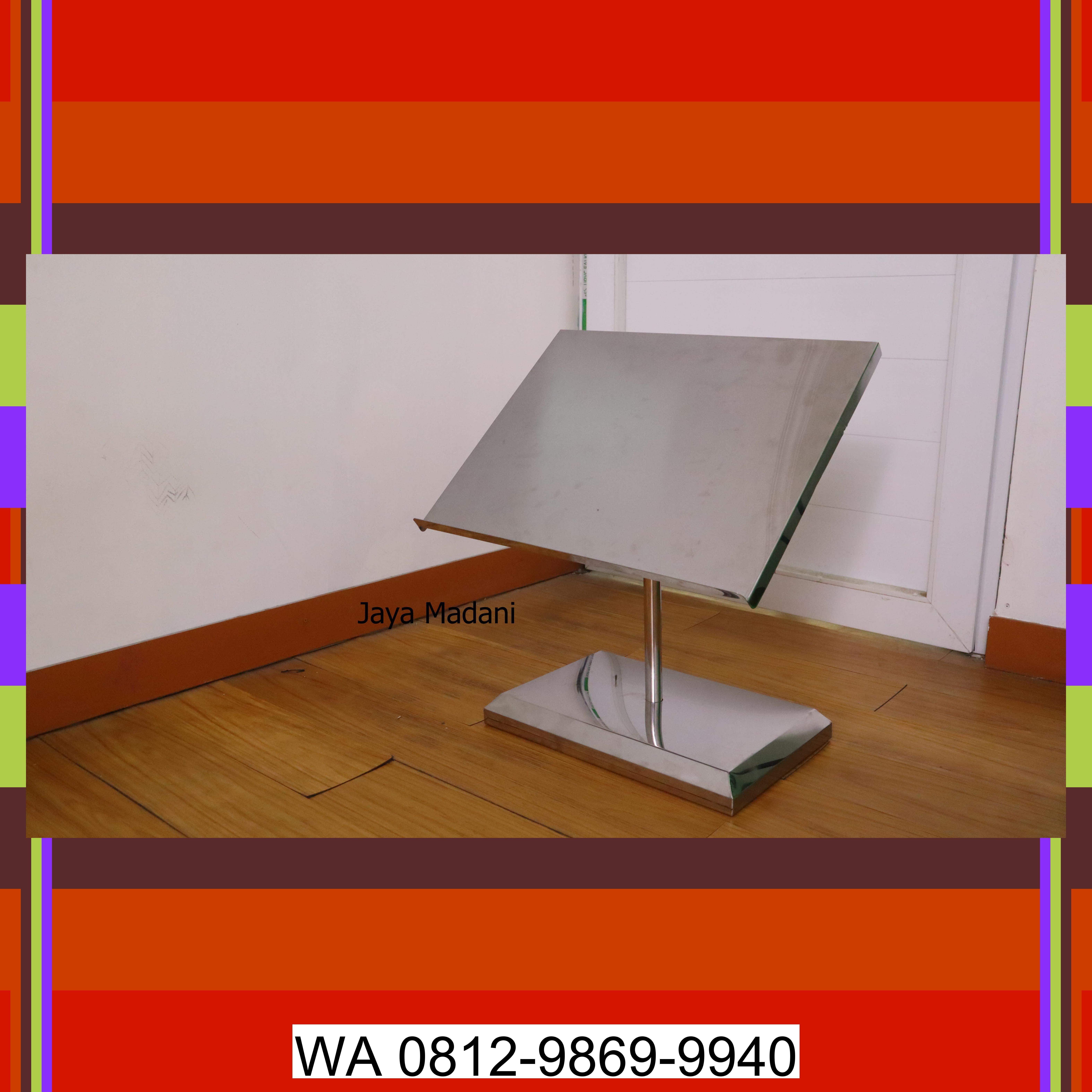 Standing Al-Qur'an berbahan stainless steel dengan desain modern dan elegan, dirancang untuk memudahkan berbagai kegiatan ibadah Anda.