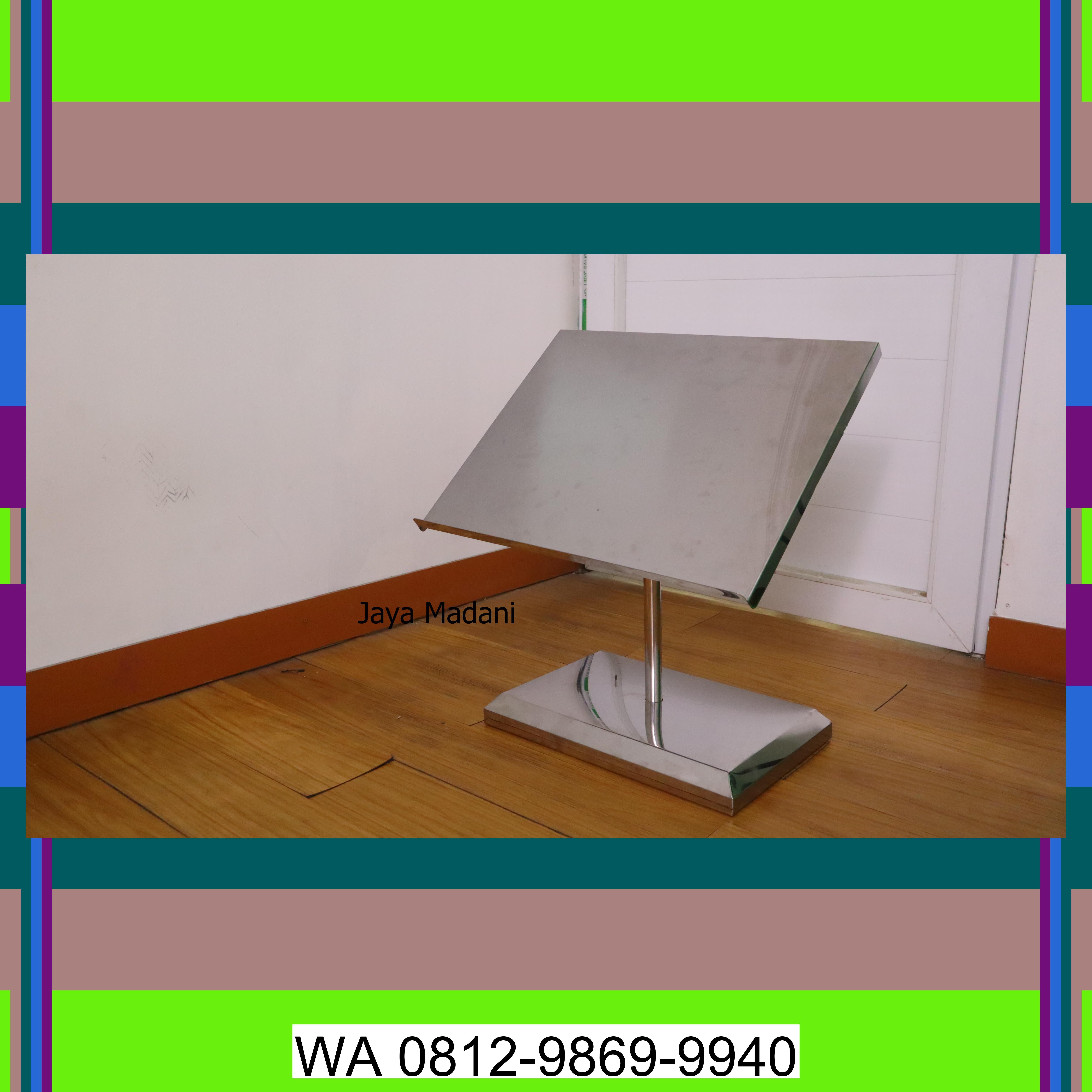 Standing Al-Qur'an berbahan stainless steel dengan desain modern dan elegan, dirancang untuk memudahkan berbagai kegiatan ibadah Anda.
