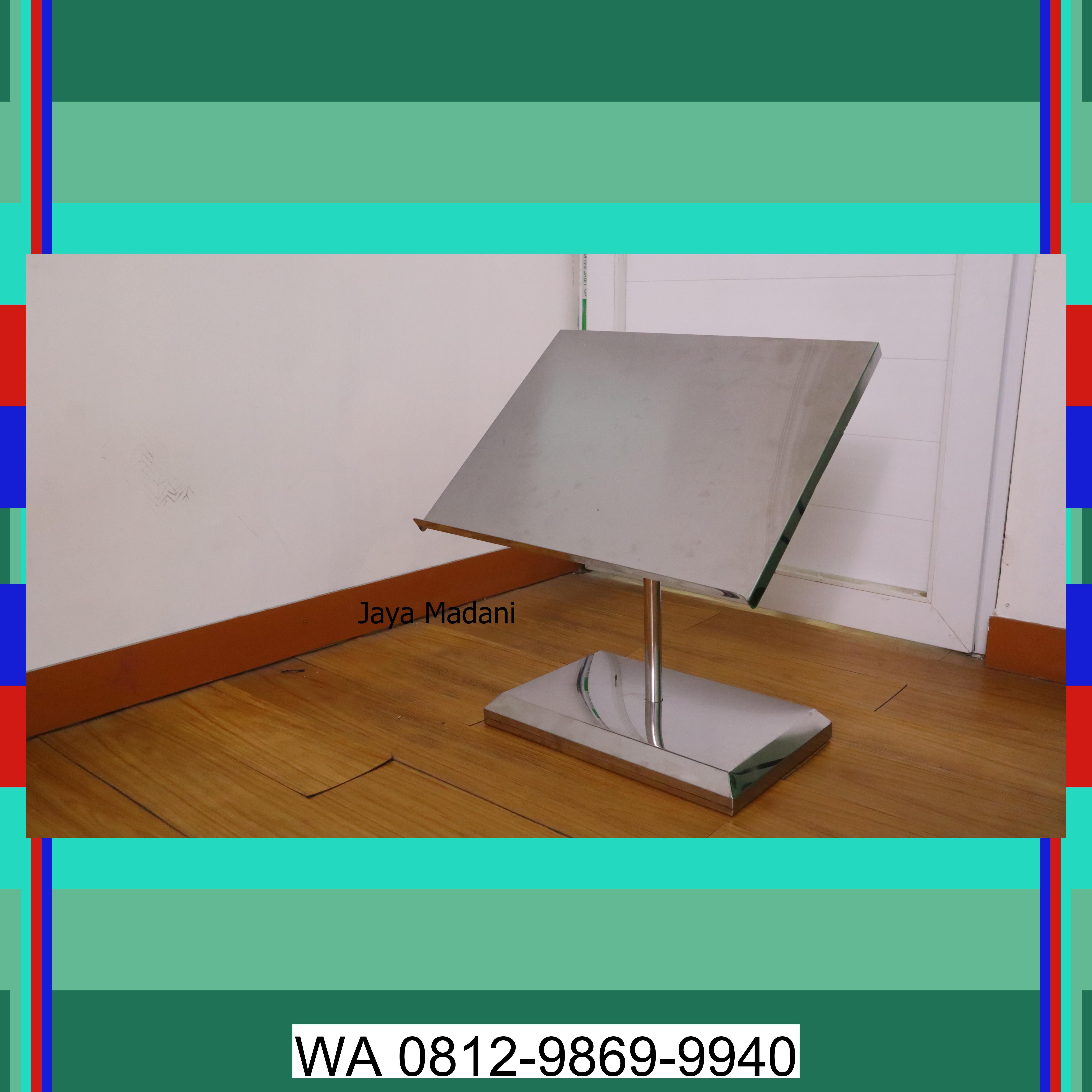 Standing Al-Qur'an berbahan stainless steel dengan desain modern dan elegan, dirancang untuk memudahkan berbagai kegiatan ibadah Anda.