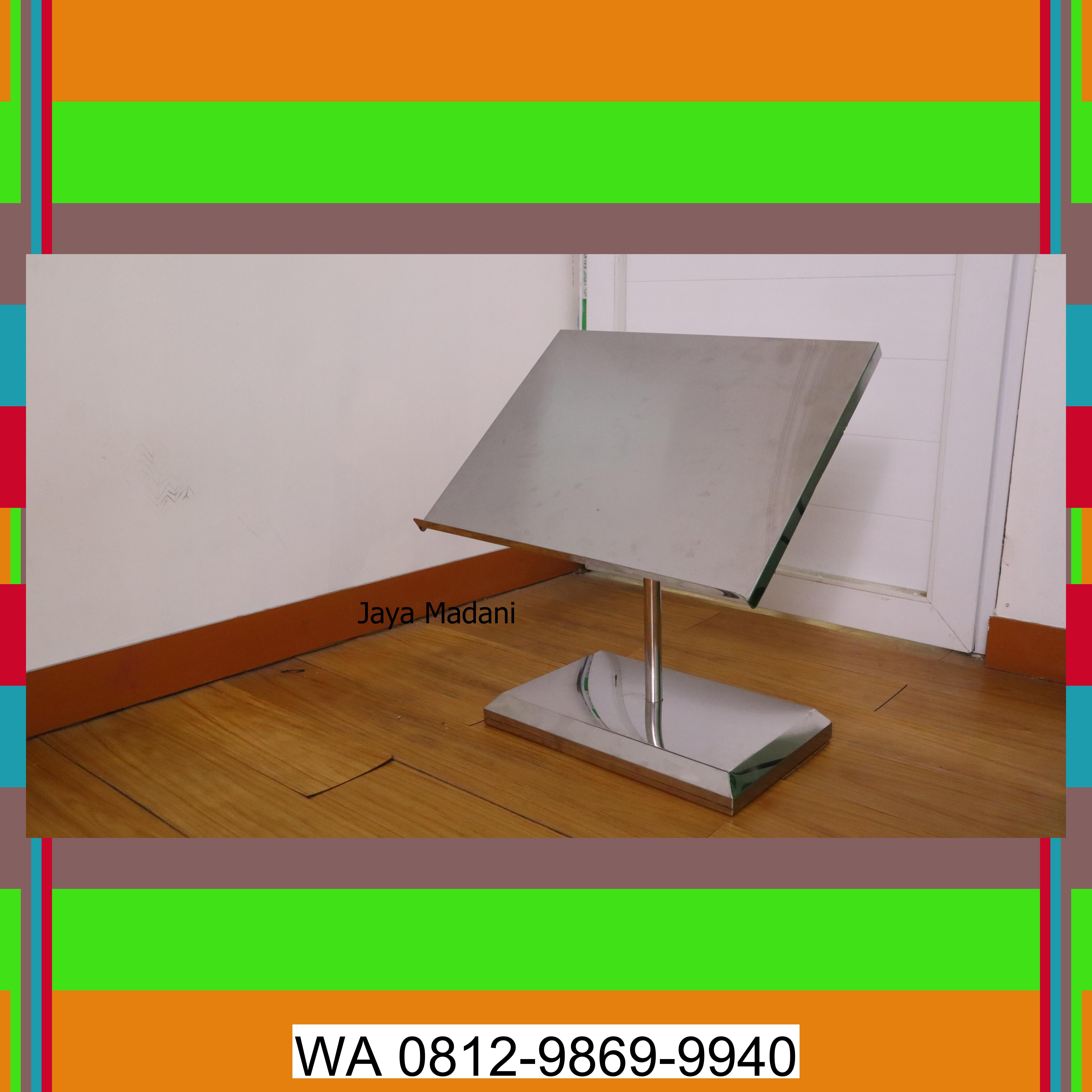 Standing Al-Qur'an berbahan stainless steel dengan desain modern dan elegan, dirancang untuk memudahkan berbagai kegiatan ibadah Anda.