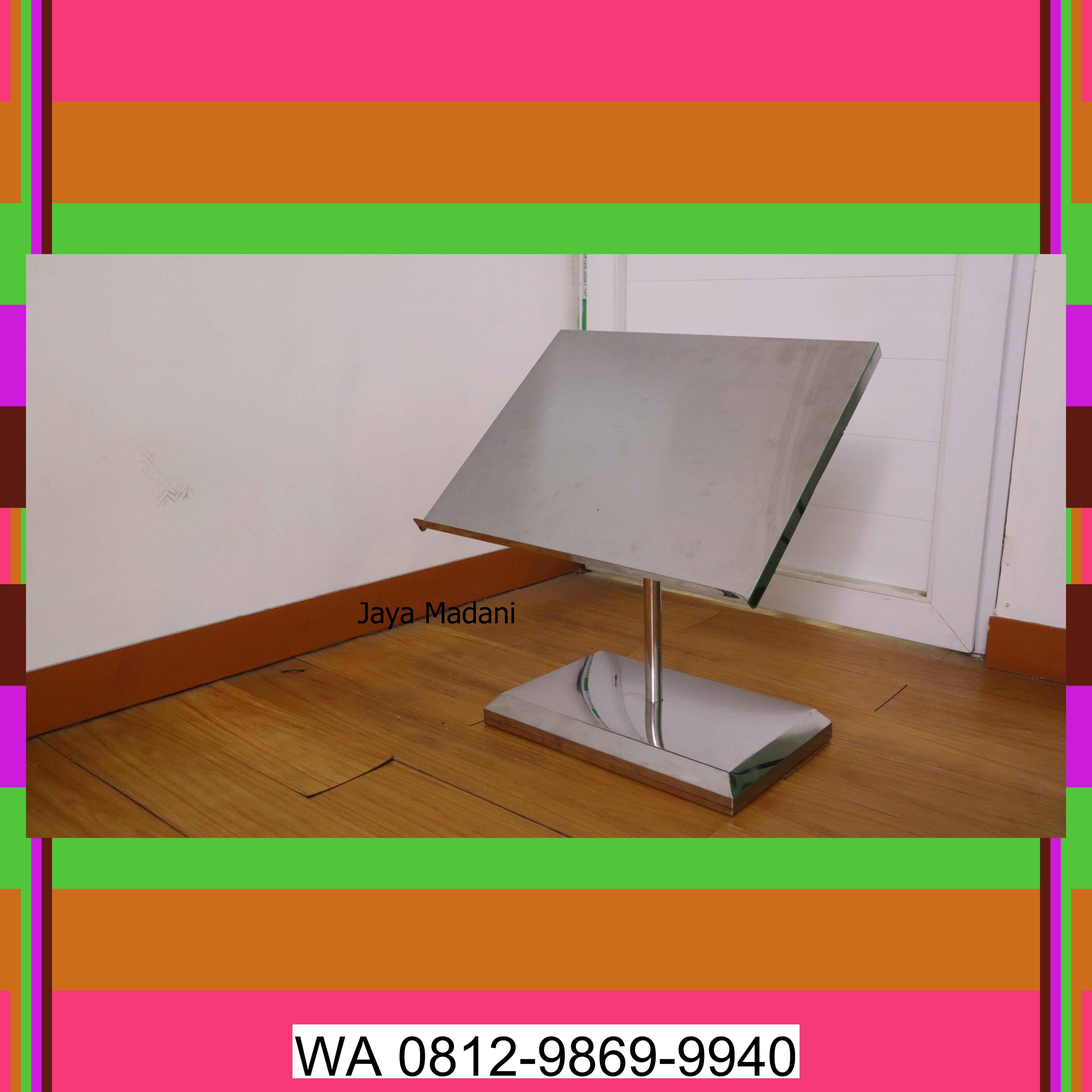 Standing Al-Qur'an berbahan stainless steel dengan desain modern dan elegan, dirancang untuk memudahkan berbagai kegiatan ibadah Anda.