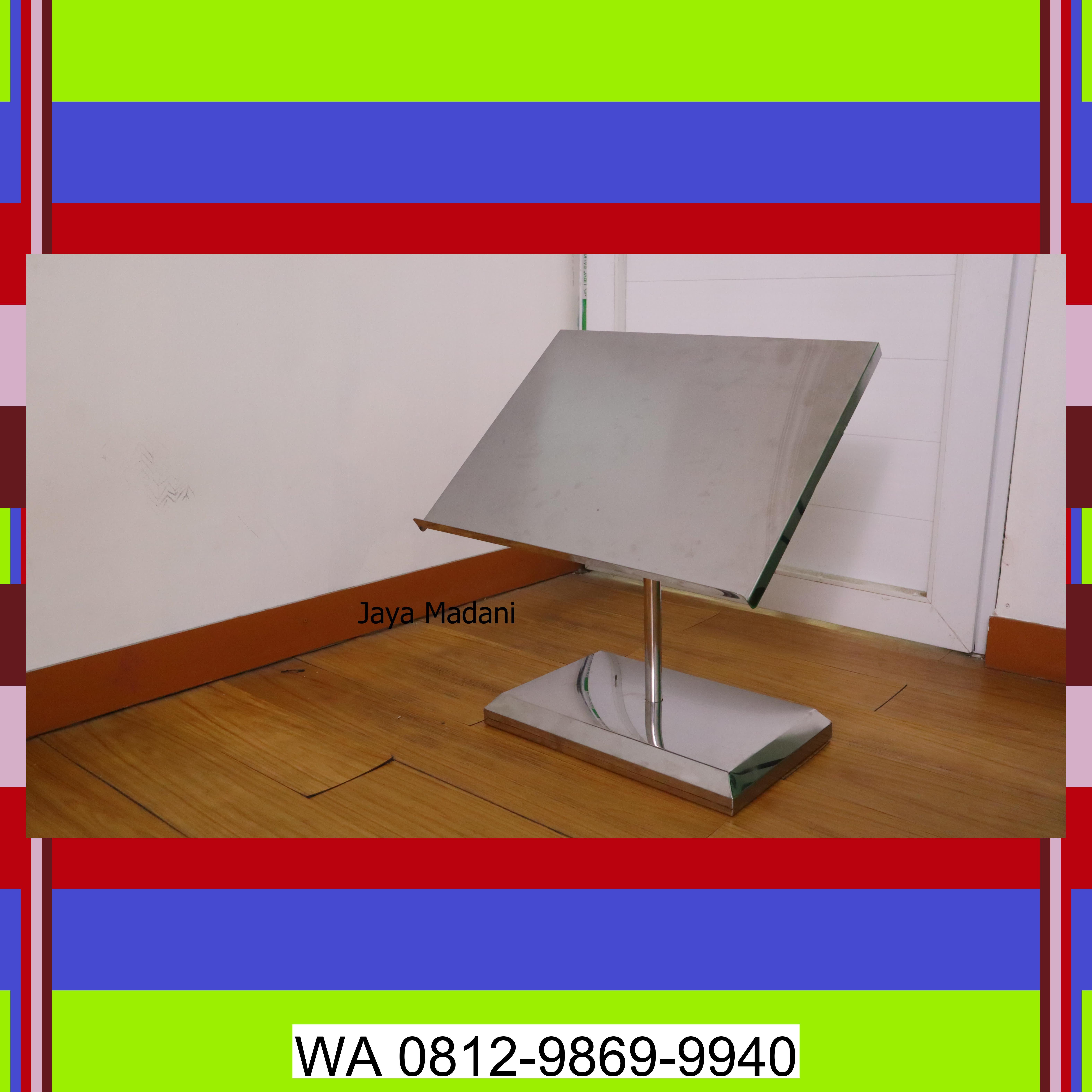 Standing Al-Qur'an berbahan stainless steel dengan desain modern dan elegan, dirancang untuk memudahkan berbagai kegiatan ibadah Anda.